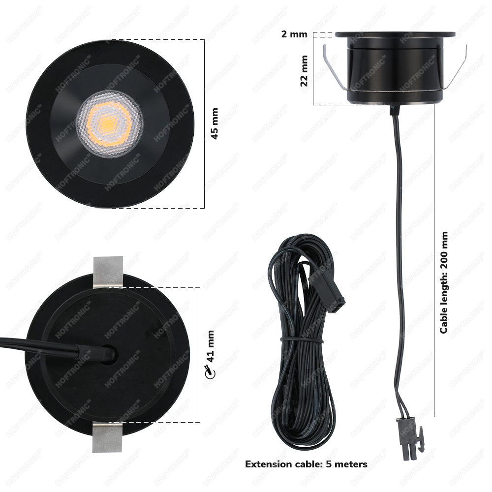 - Mini inbouwspots: Inbouwdiepte: 26 mm, Zaagmaat: Ø 40mm, diameter: Ø 45mm, Verbruik: 3 Watt