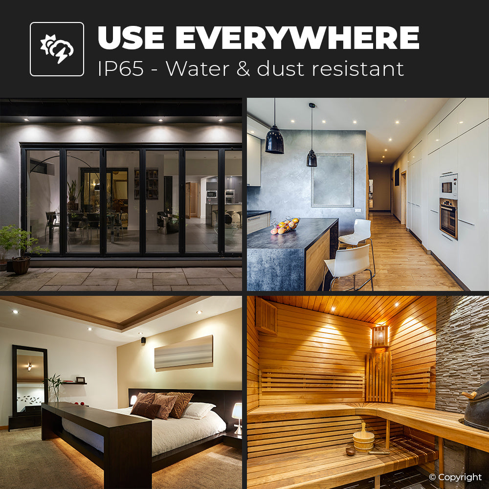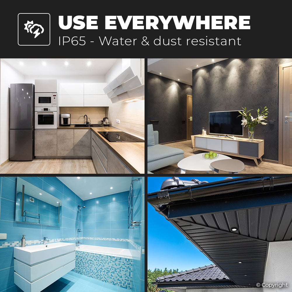 - Waterdichte plafondspots: Door de IP-waarde van IP65 zijn de LED spots geschikt voor de badkamer, woonkamer en tuin.