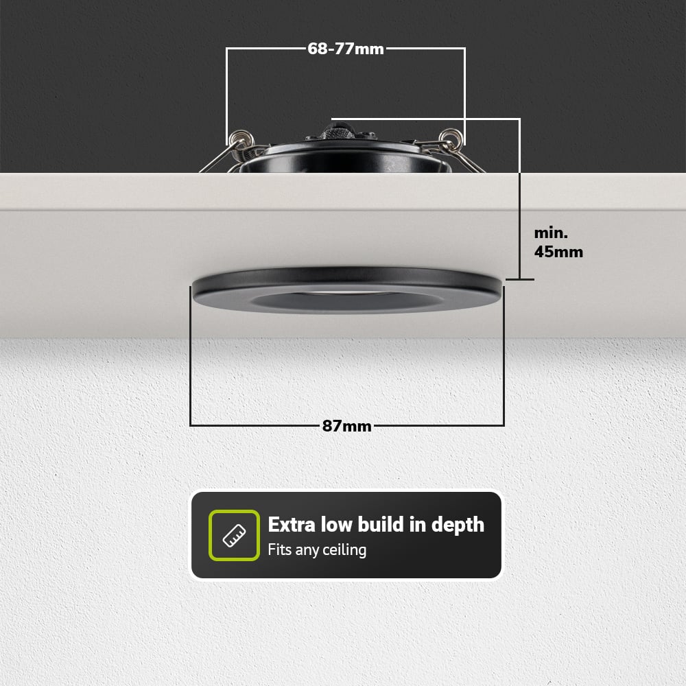 - Extra lage inbouwdiepte: Deze inbouwspots hebben een inbouwdiepte van slechts 45 mm. Hierdoor passen ze in ieder plafond.