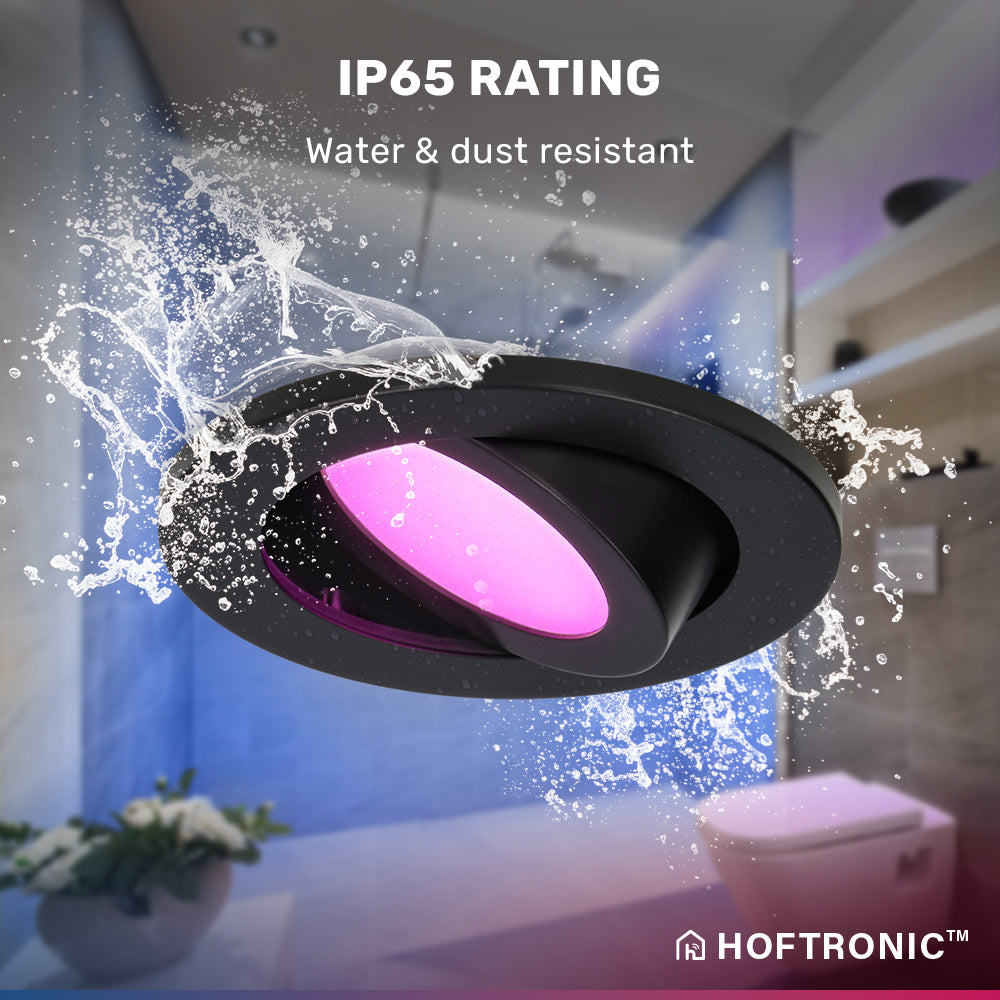 Deze kantelbare LED inbouwspots verbruiken slechts 6 Watt (vervangt 50 Watt) en is IP65 waterdicht. Deze slimme RGBWW LED spots kunnen in 16.5 miljoen verschillende kleuren veranderen evenals warm wit en koel wit, ideaal om je eigen sfeer te creëren.