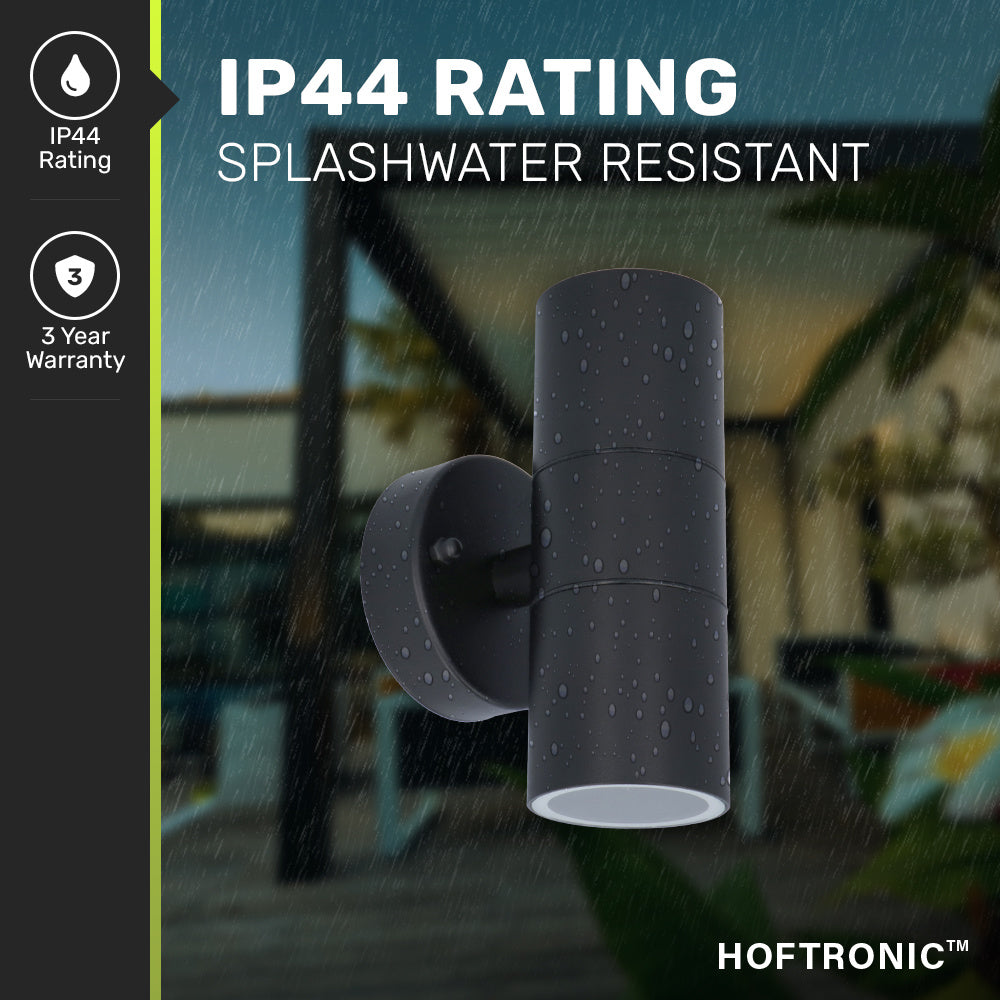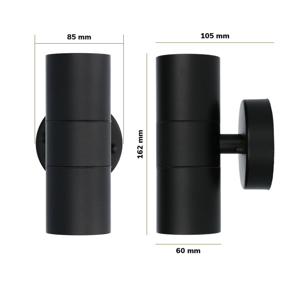 Moderne Up & Down light wand buitenlamp geschikt voor GU10 spots. Deze mooie wandlamp is door de IP44 waarde geschikt voor vochtige ruimtes, tevens zijn de spots eenvoudig vervangbaar en ontvang je 2 jaar garantie.