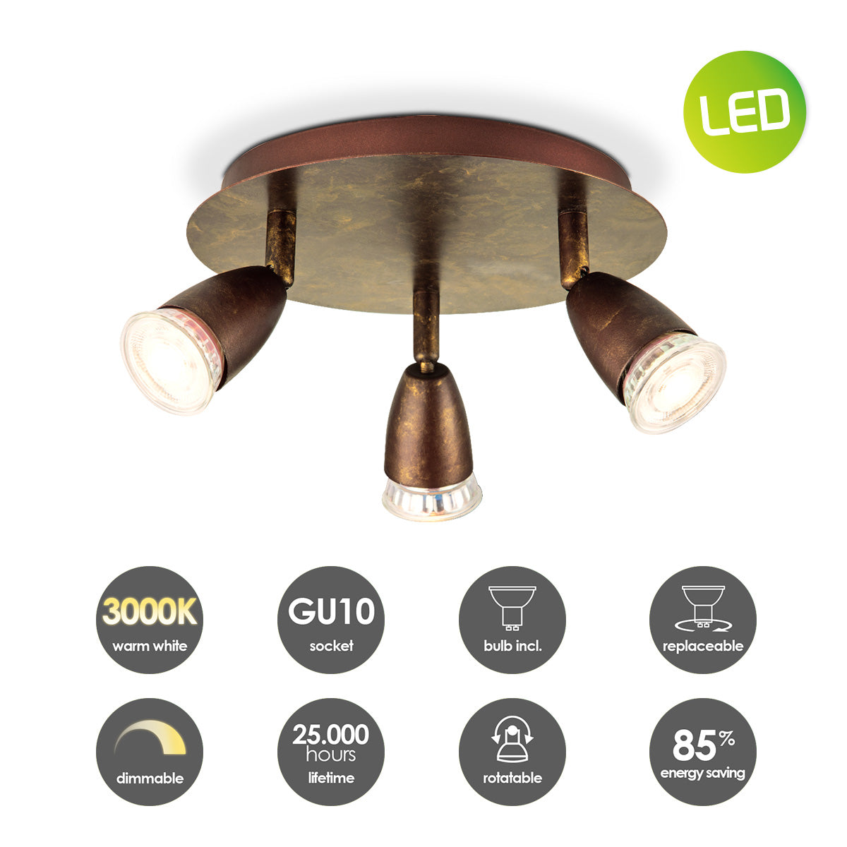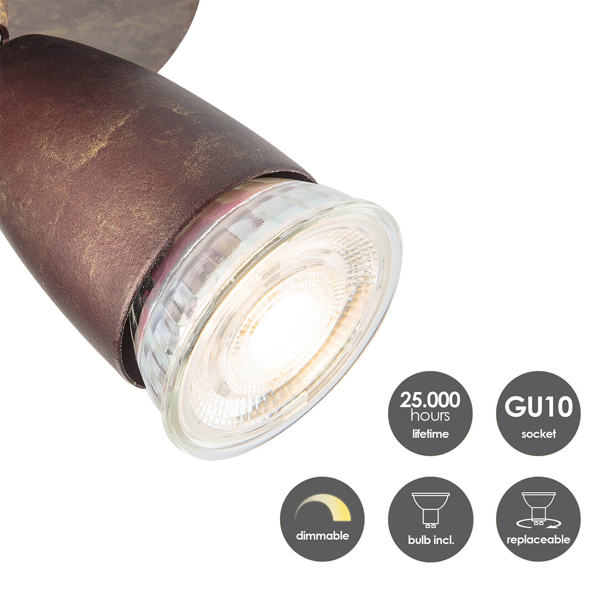 - De opbouwspot wordt geleverd inclusief dimbare GU10 LED lichtbron - 5W, 390lm, 3000K - geeft warm wit licht.