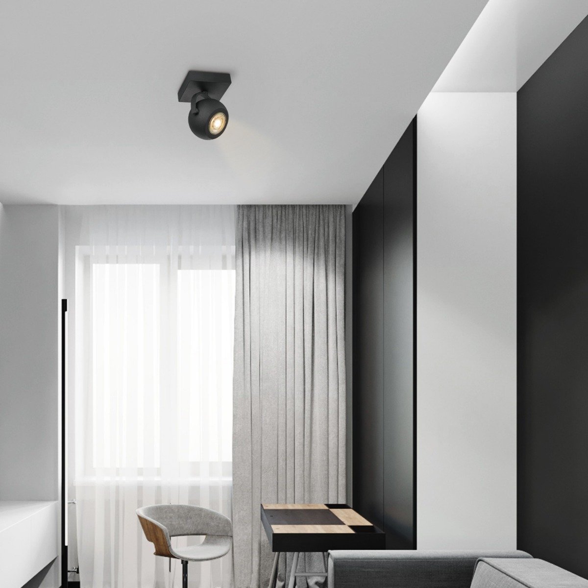 De matzwarte 1-lichts LED opbouwspot Nop is een top sfeermaker in een industrieel of modern interieur. Inclusief 1 x GU10 LED lamp van slechts 5,8 watt. Het zwarte bolspotje is verstelbaar (kantelbaar/draaibaar) én dimbaar.