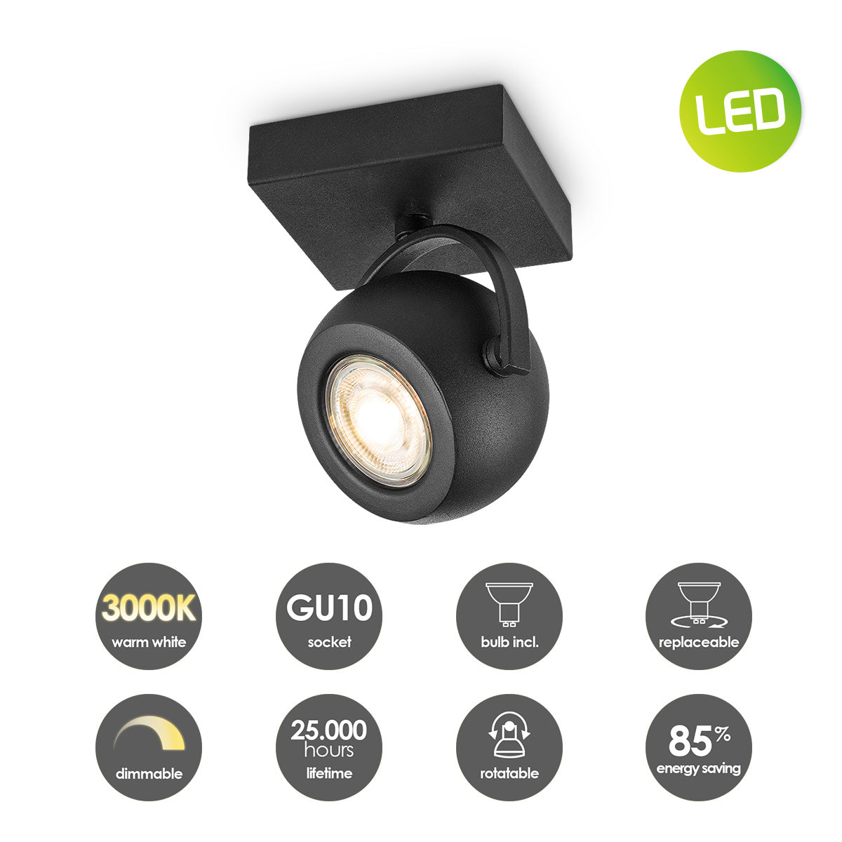 - De wandspot wordt geleverd inclusief dimbare GU10 LED lichtbron - 5W, 390lm, 3000K - geeft warm wit licht.