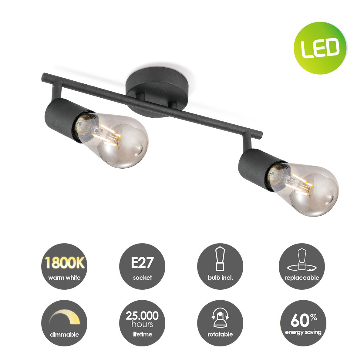 - De opbouwspot wordt geleverd inclusief dimbare E27 LED lichtbron (4W, 150lm, 1800K) - geeft warm wit licht.