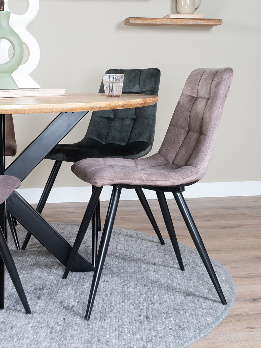 - De zitting is gemaakt van een velvet stof en heeft een gecapitonneerd patroon