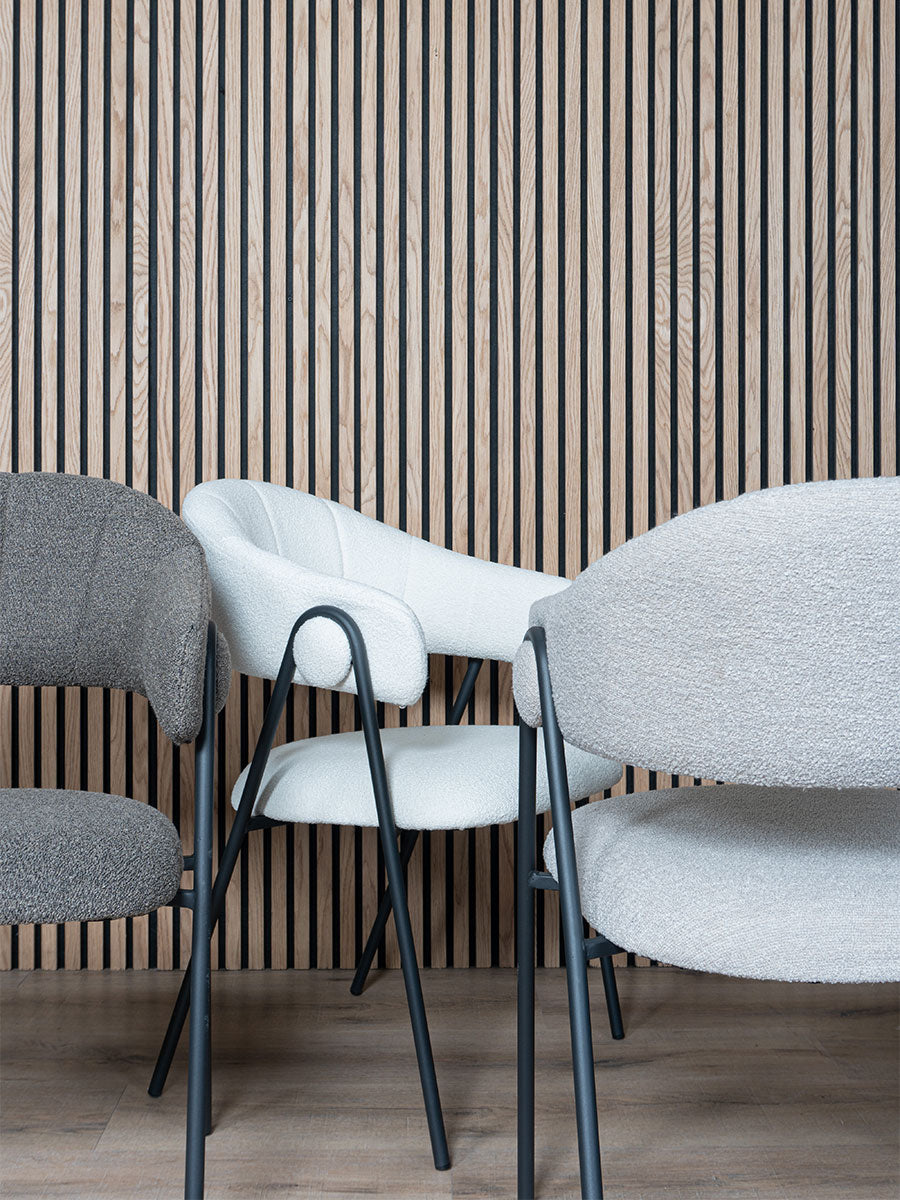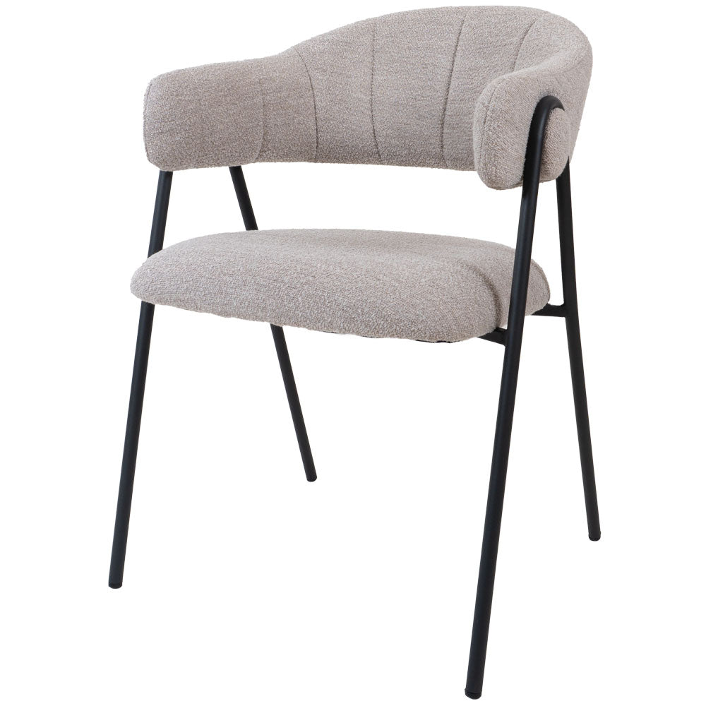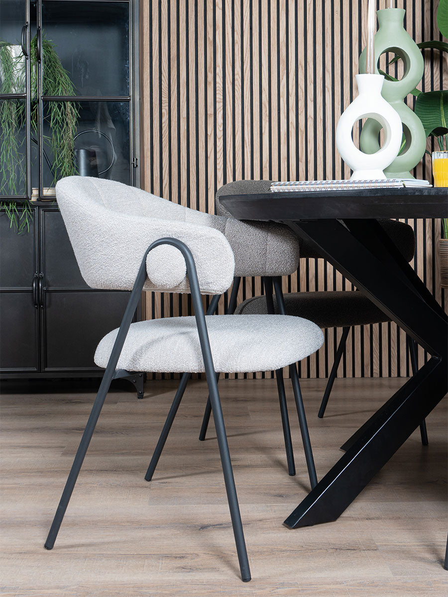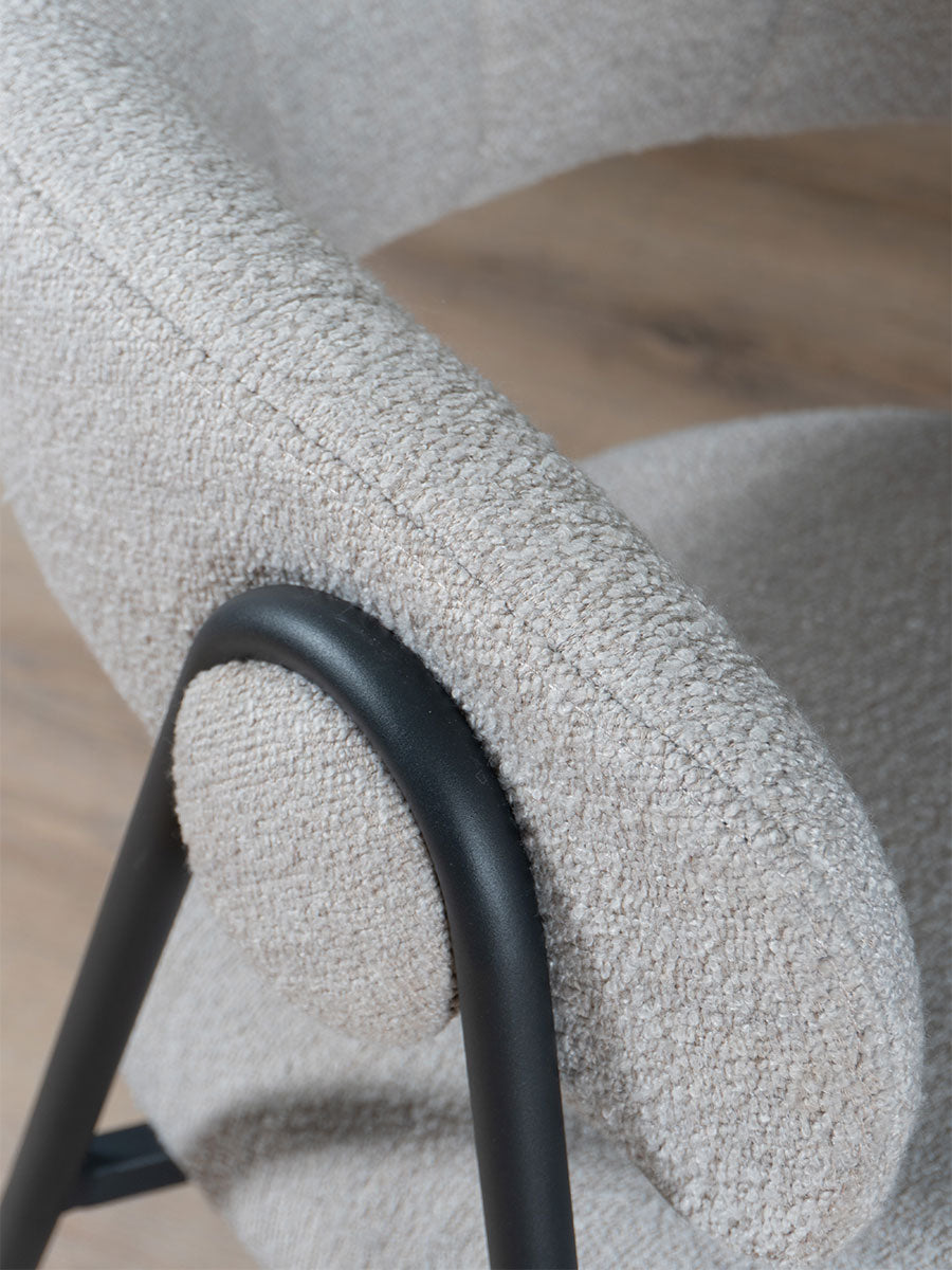 - De stoel is bekleed met een zachte boucle stof, waardoor de stoel een luxe uitstraling heeft