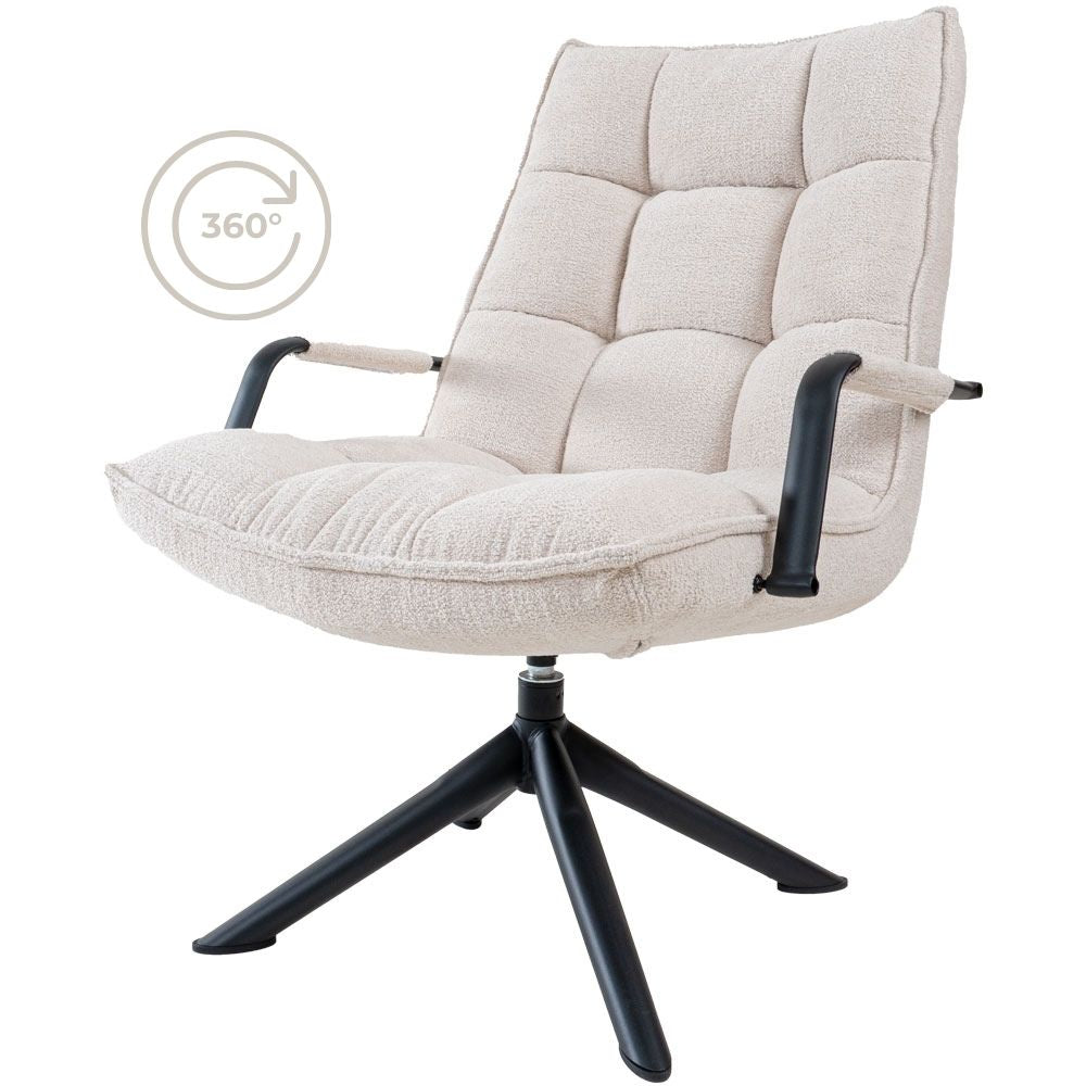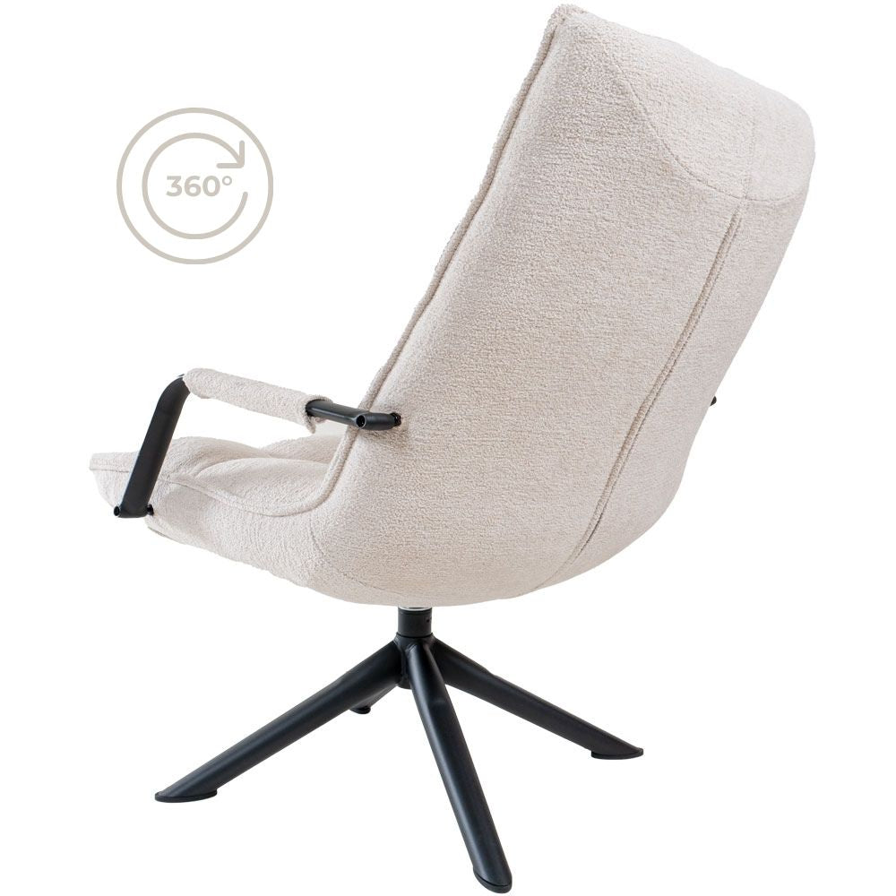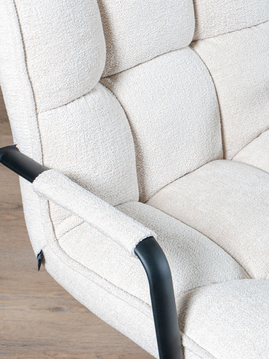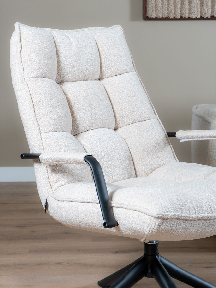 - De gestikte rug zorgt samen met de armleuningen voor een zachte en comfortabele zit en is bekleed met een boucle stof