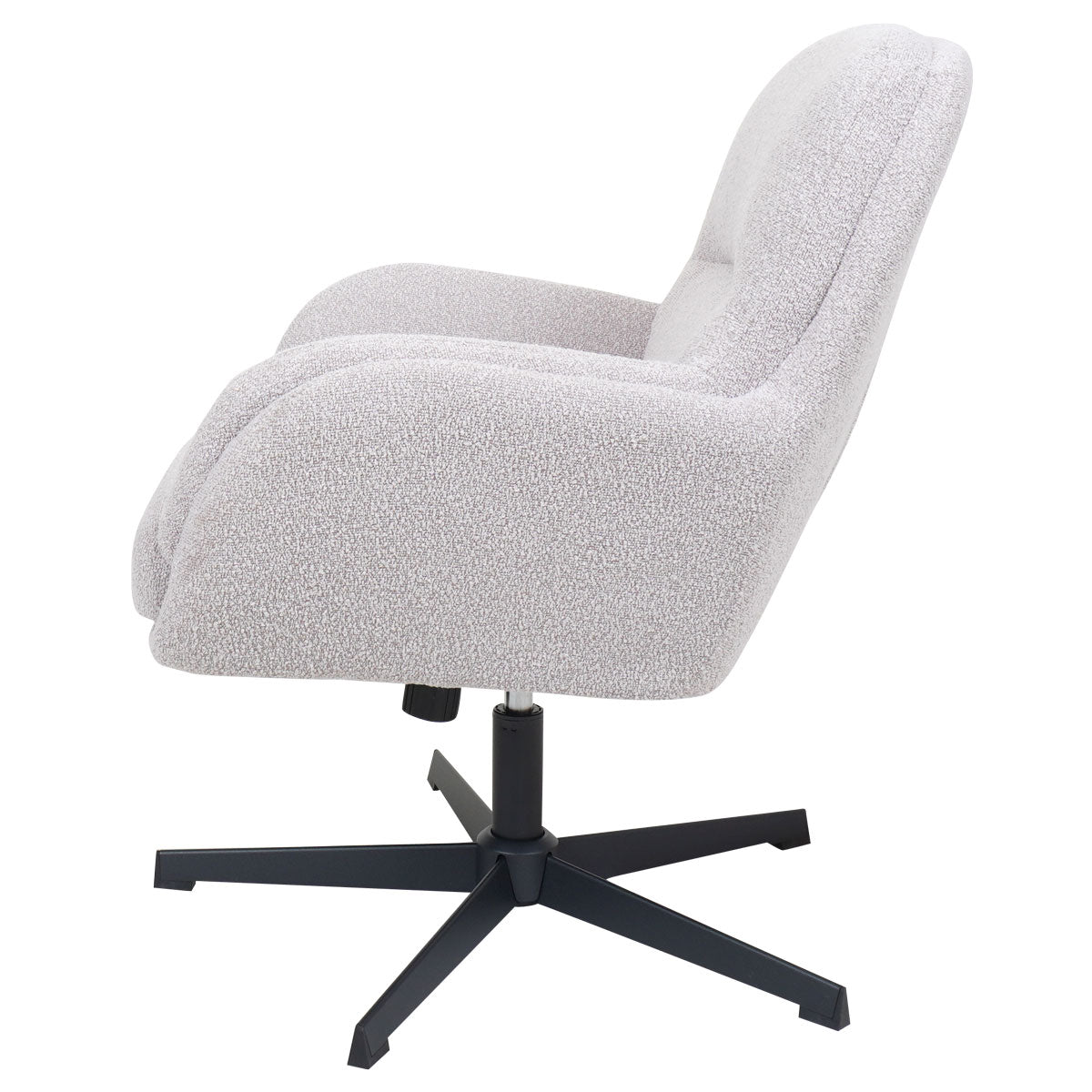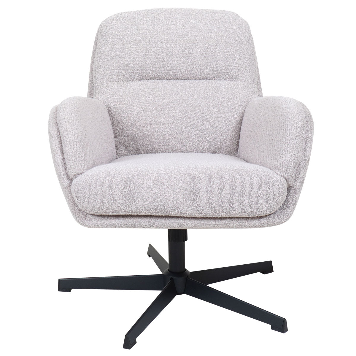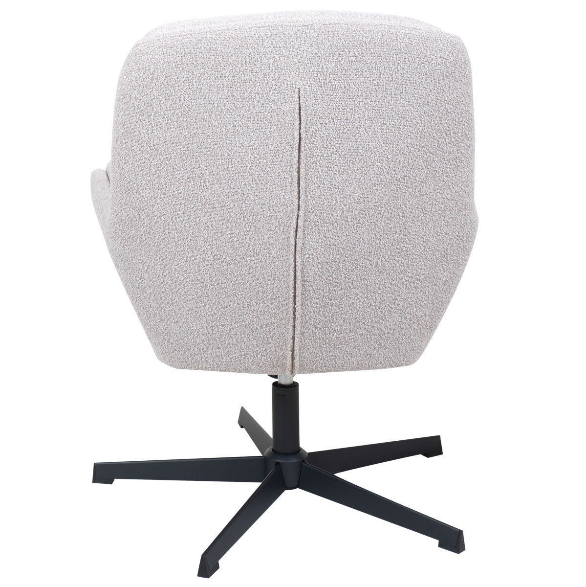 - De stoel is bekleed met een zachte bouclé stof in een neutrale, lichte kleur, wat zorgt voor een luxe en knusse uitstraling