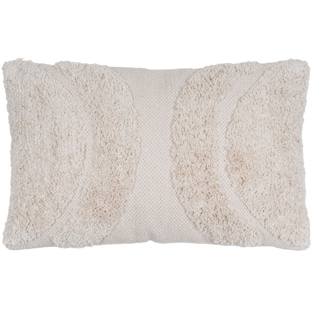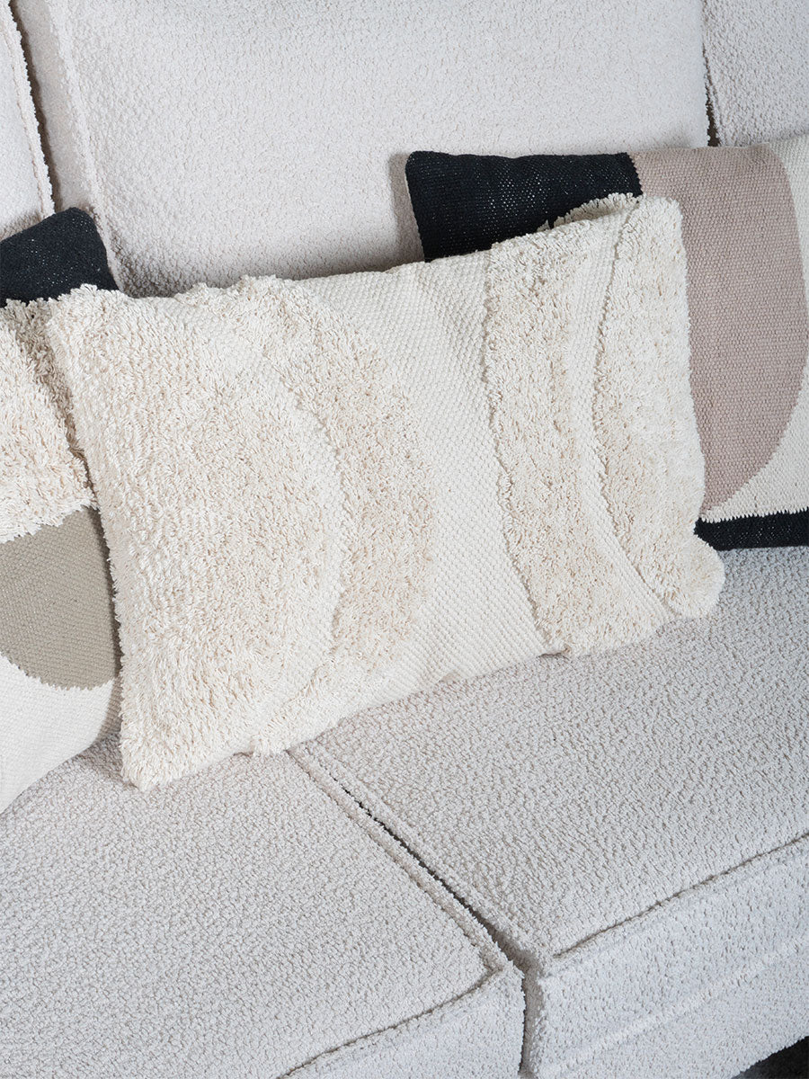 - Het kussen heeft een neutrale kleur met grafisch patroon