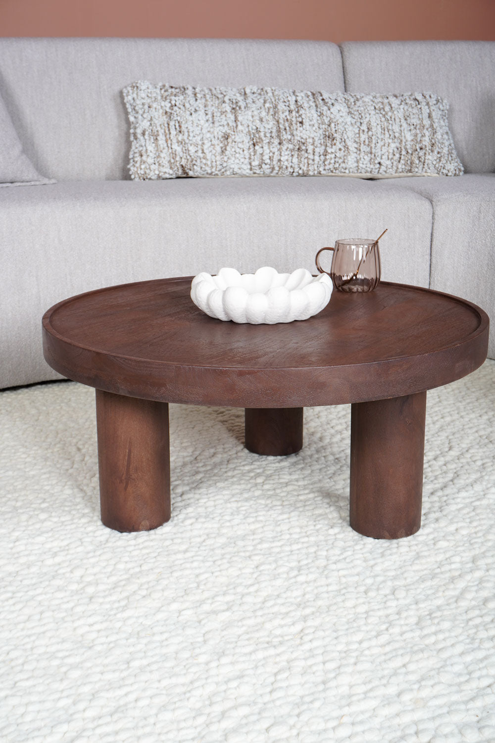 - Salontafel Tias is een ronde tafel met een diameter van 70 cm en een hoogte van 31 cm, vervaardigd uit hoogwaardig mangohout in een warme espresso