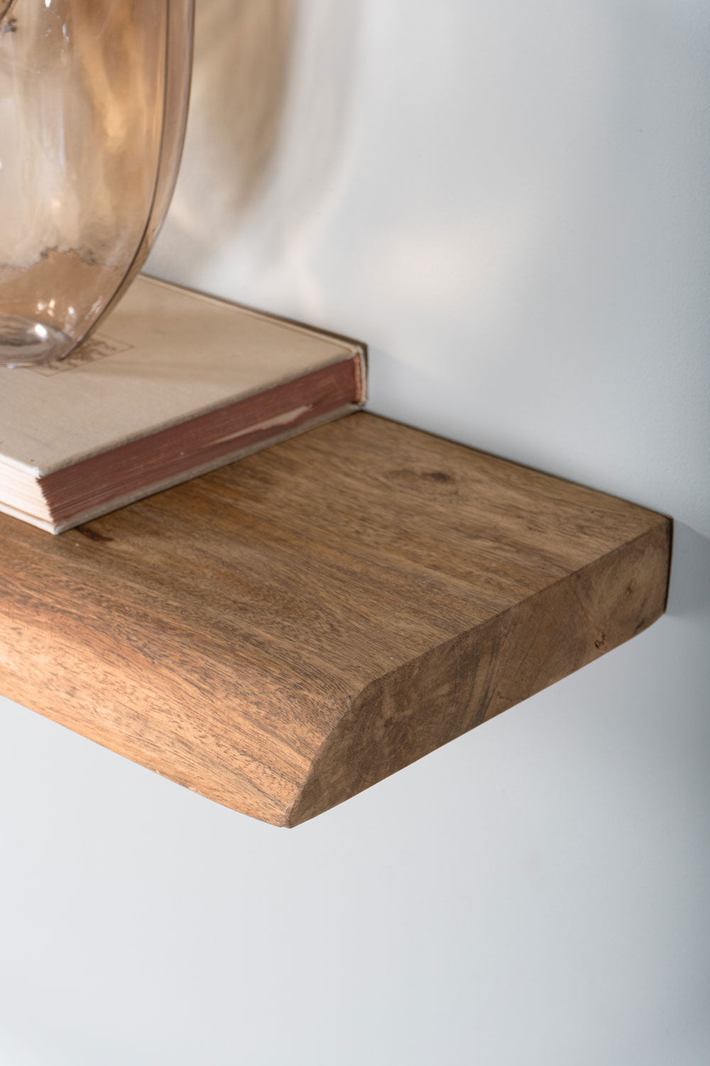 - De wandplank is gemaakt van massief mangohout, en de rand van de plank volgt de natuurlijke vorm van de boom, wat deze wanddecoratie een natuurlijke