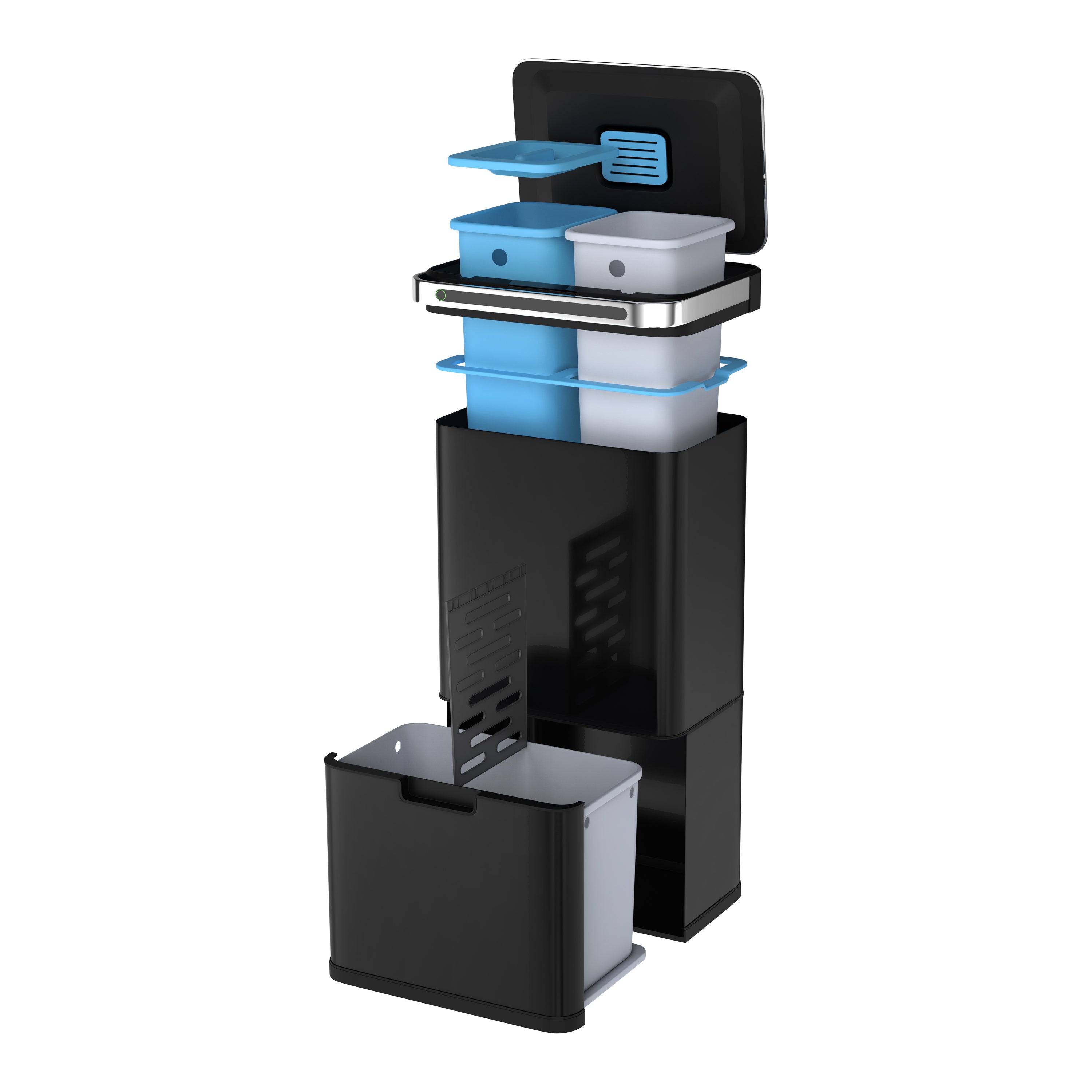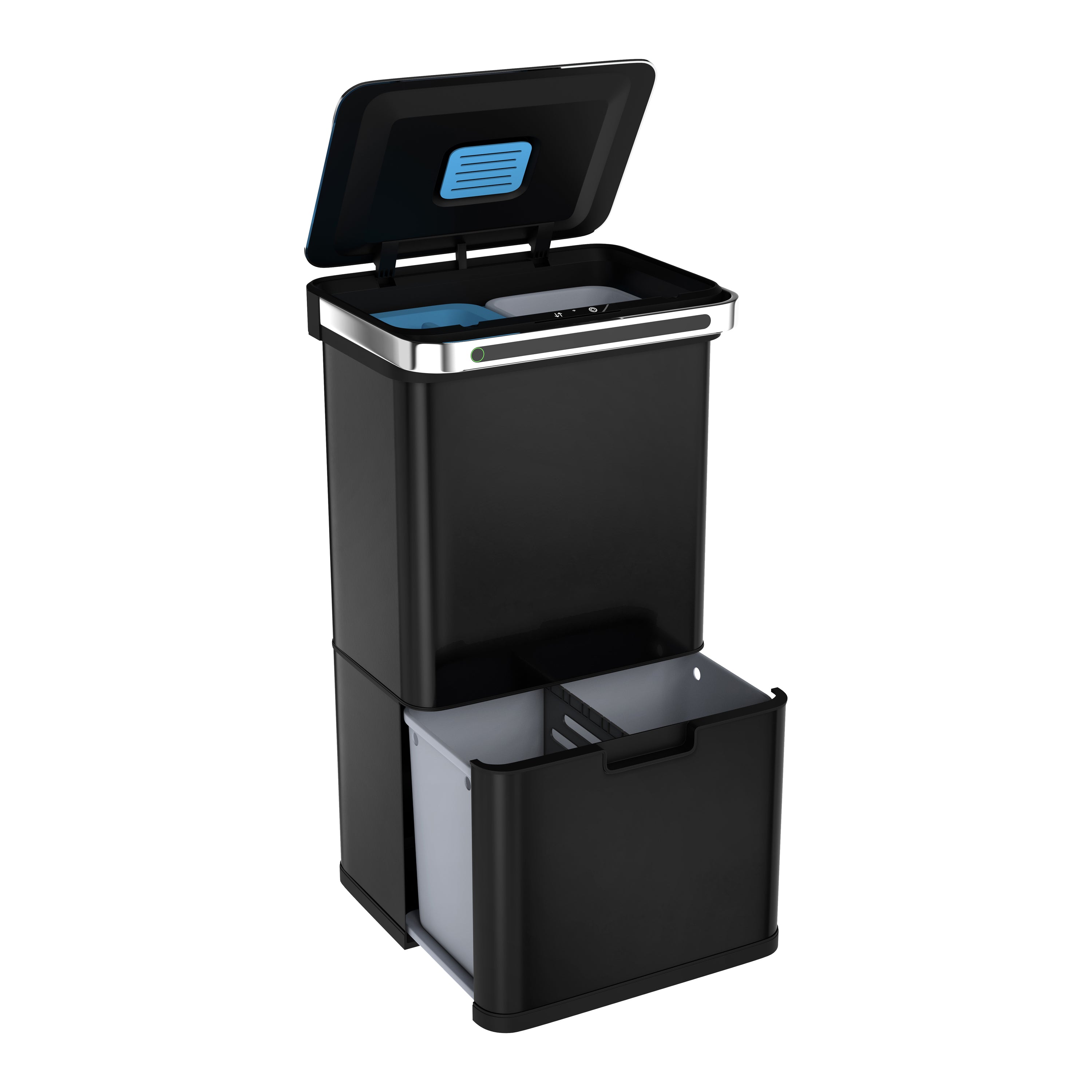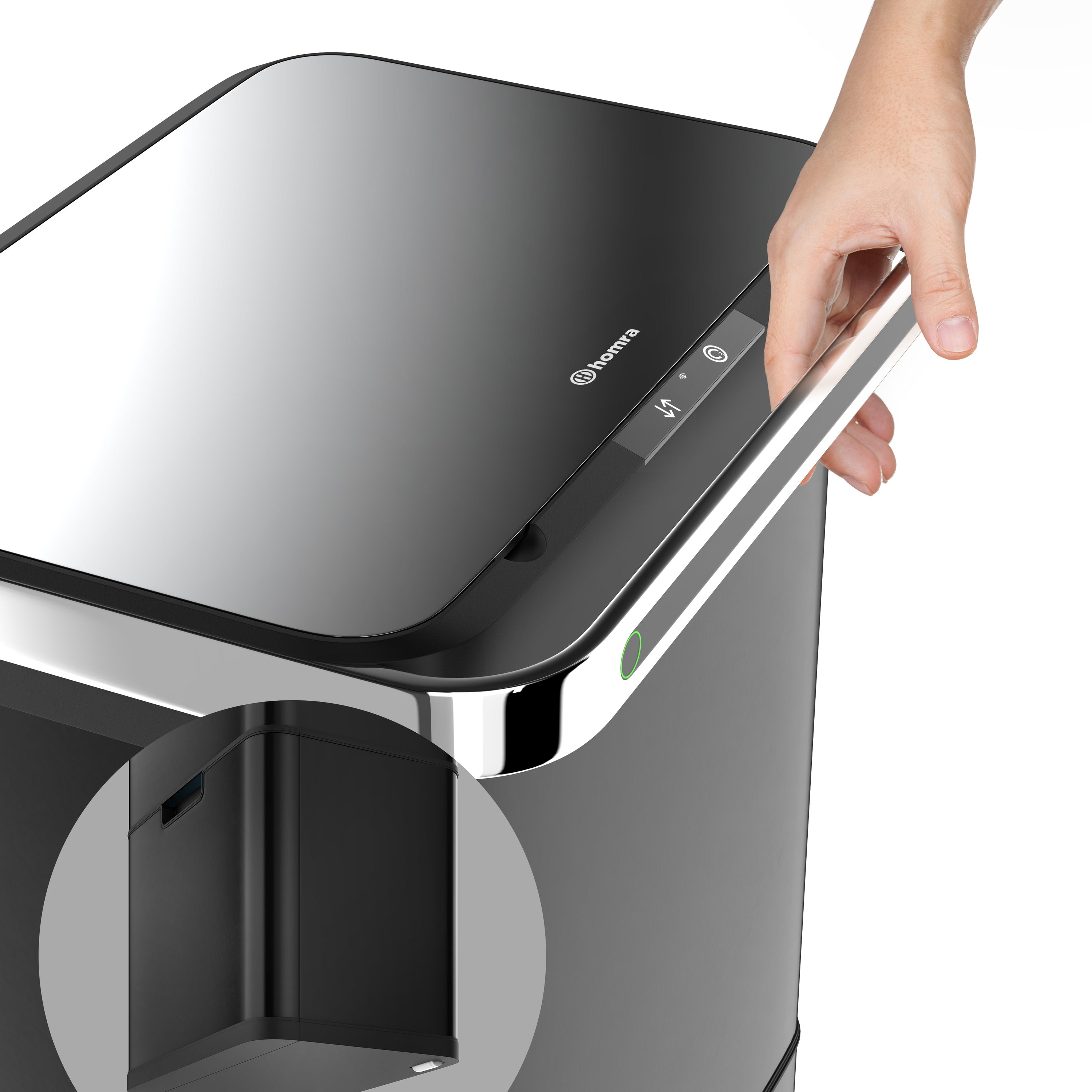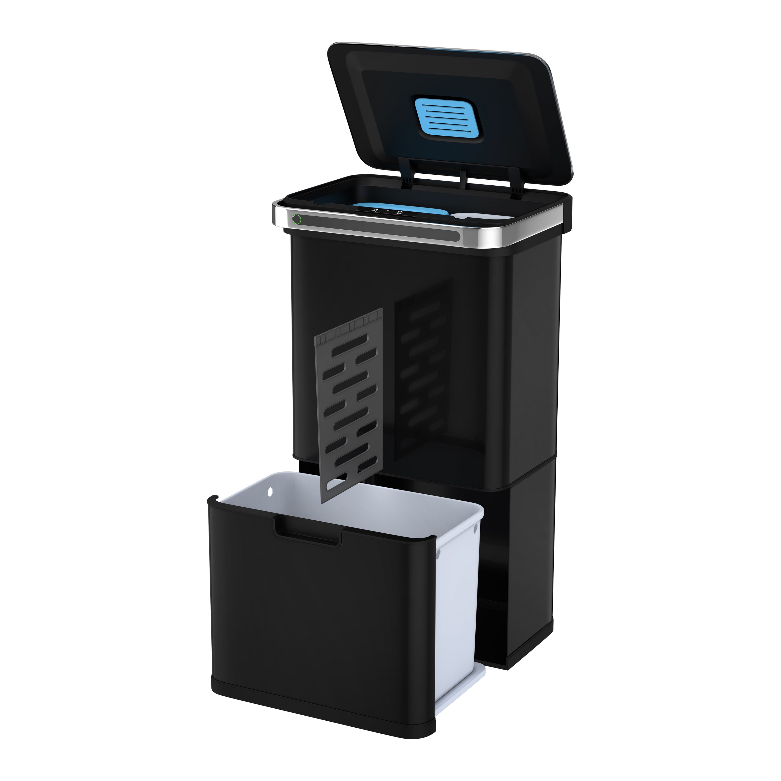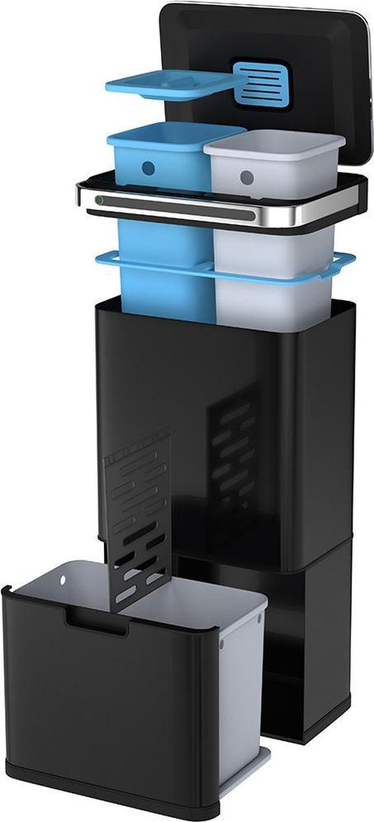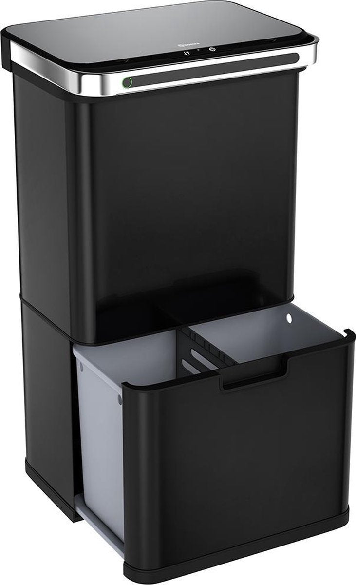 - PRAKTISCHE BEDIENING - Het is mogelijk om de bovenste twee compartimenten volledig contactloos te vullen. De sensor van de bovenste compartimenten reageert op beweging op een afstand van 15 tot 20 cm waarbij de deksel direct opengaat. Na 5 seconden sluit de deksel zich automatisch weer. De deksel is tevens handmatig te openen door een druk op de knop. De rolbare lade aan de onderzijde glijdt per handgreep naar voren en terug.