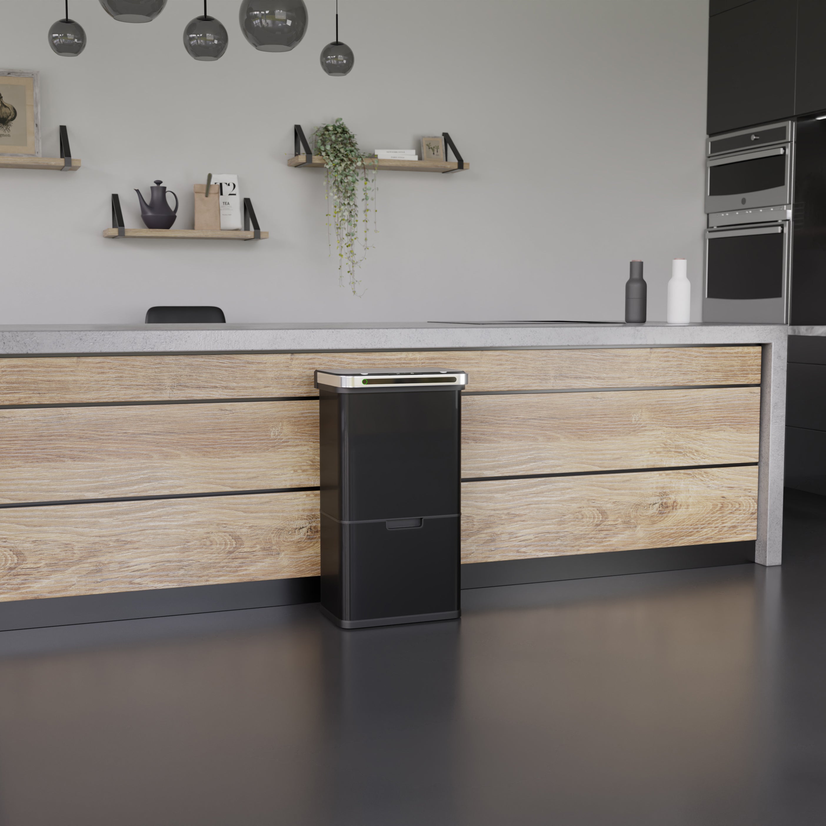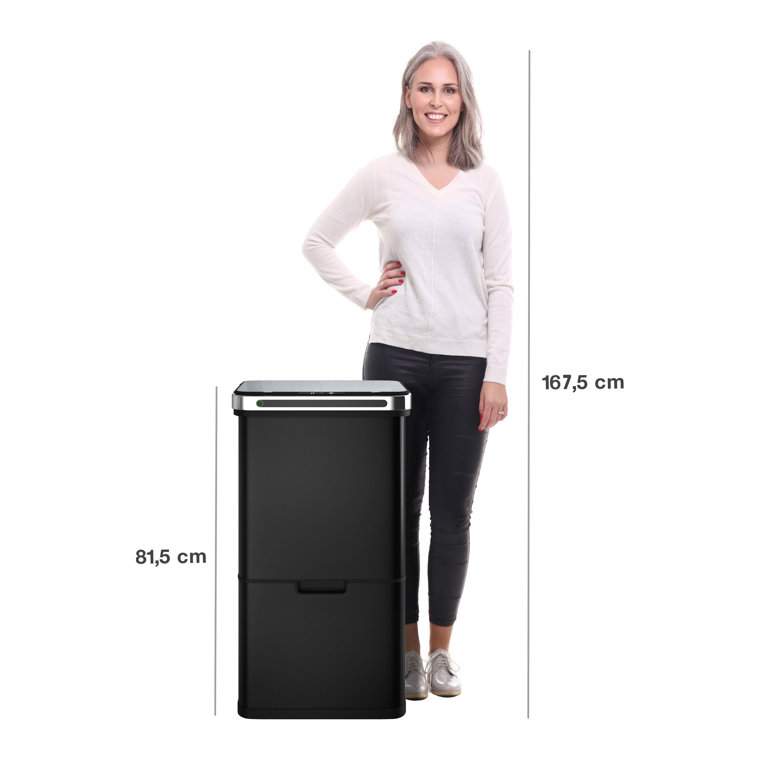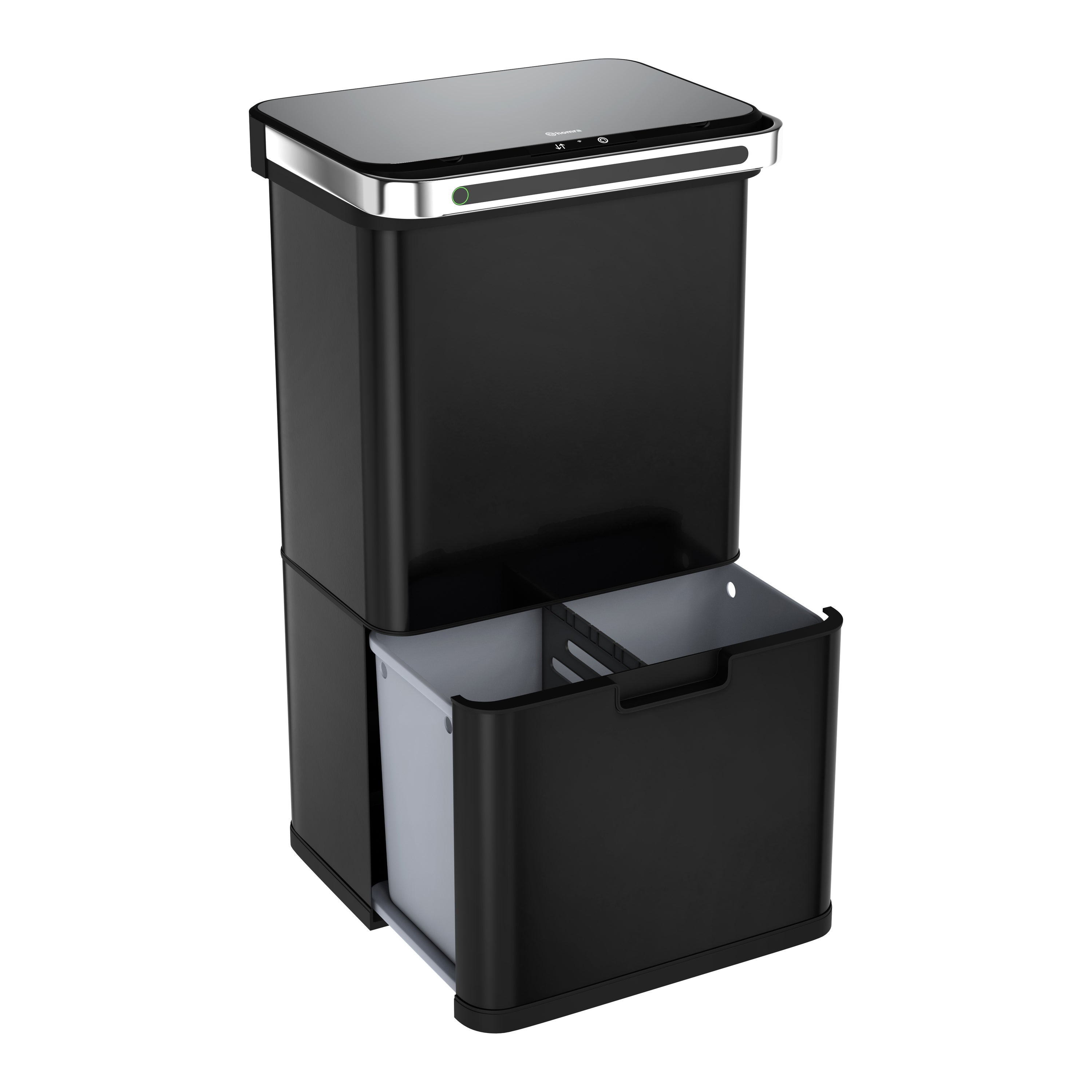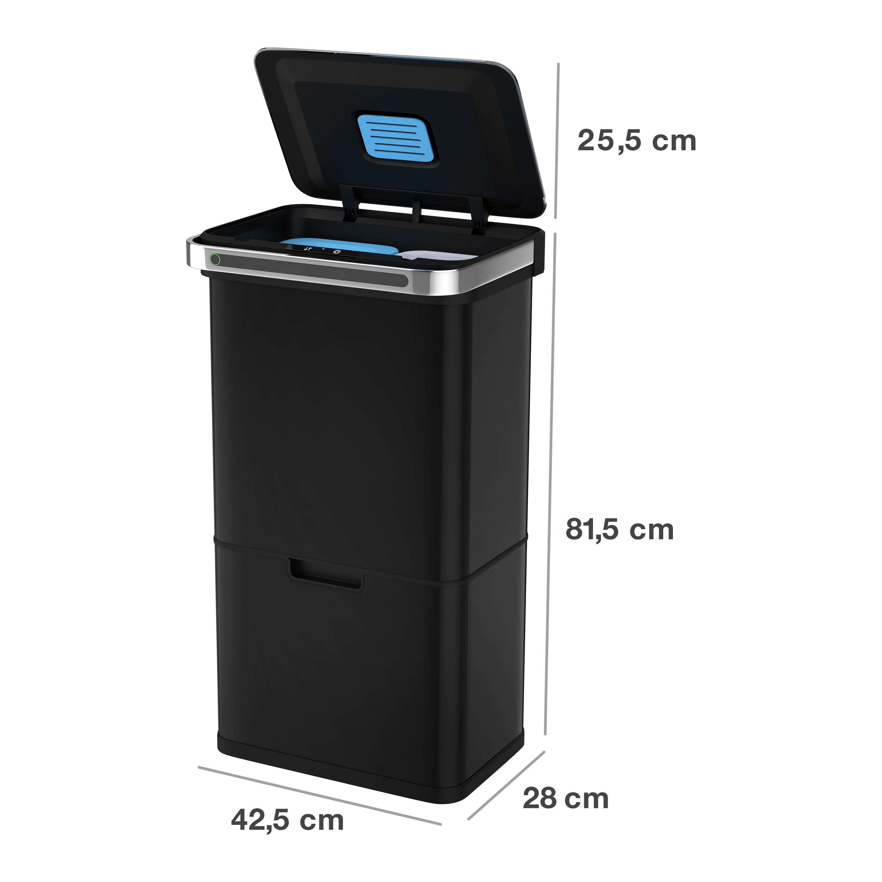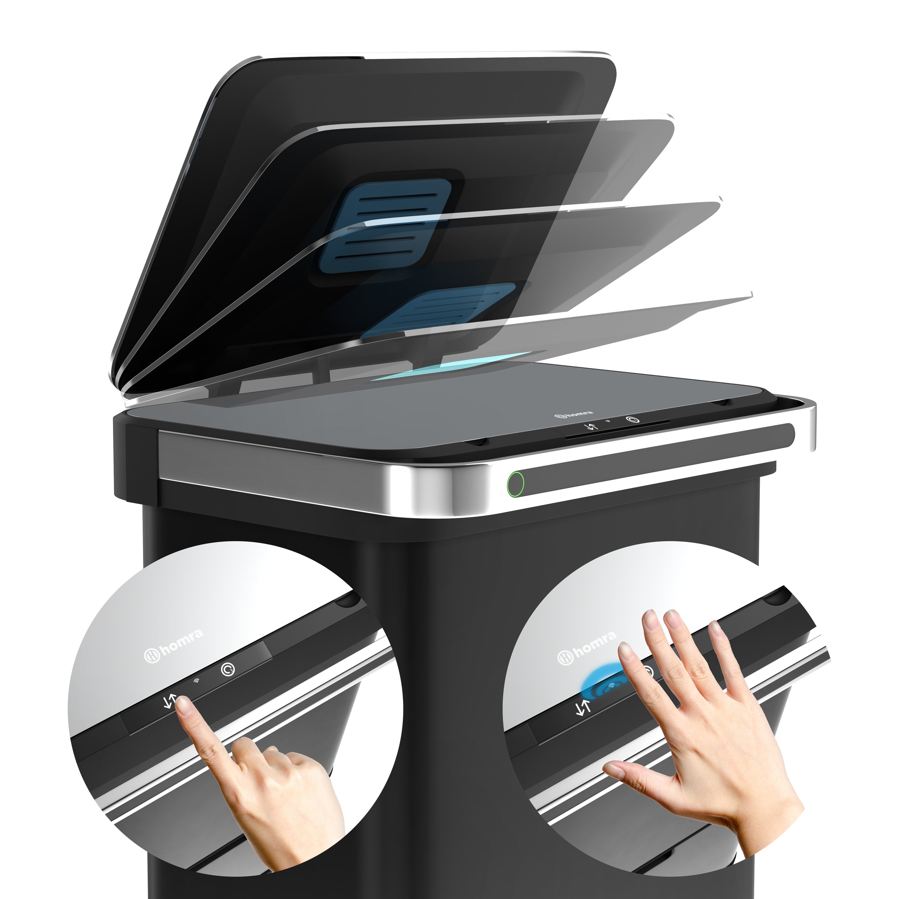 - PRAKTISCHE BEDIENING - Het is mogelijk om de bovenste twee compartimenten volledig contactloos te vullen. De sensor van de bovenste compartimenten reageert op beweging op een afstand van 15 tot 20 cm waarbij de deksel direct opengaat. Na 5 seconden sluit de deksel zich automatisch weer. De deksel is tevens handmatig te openen door een druk op de knop. De rolbare lade aan de onderzijde glijdt per handgreep naar voren en terug.