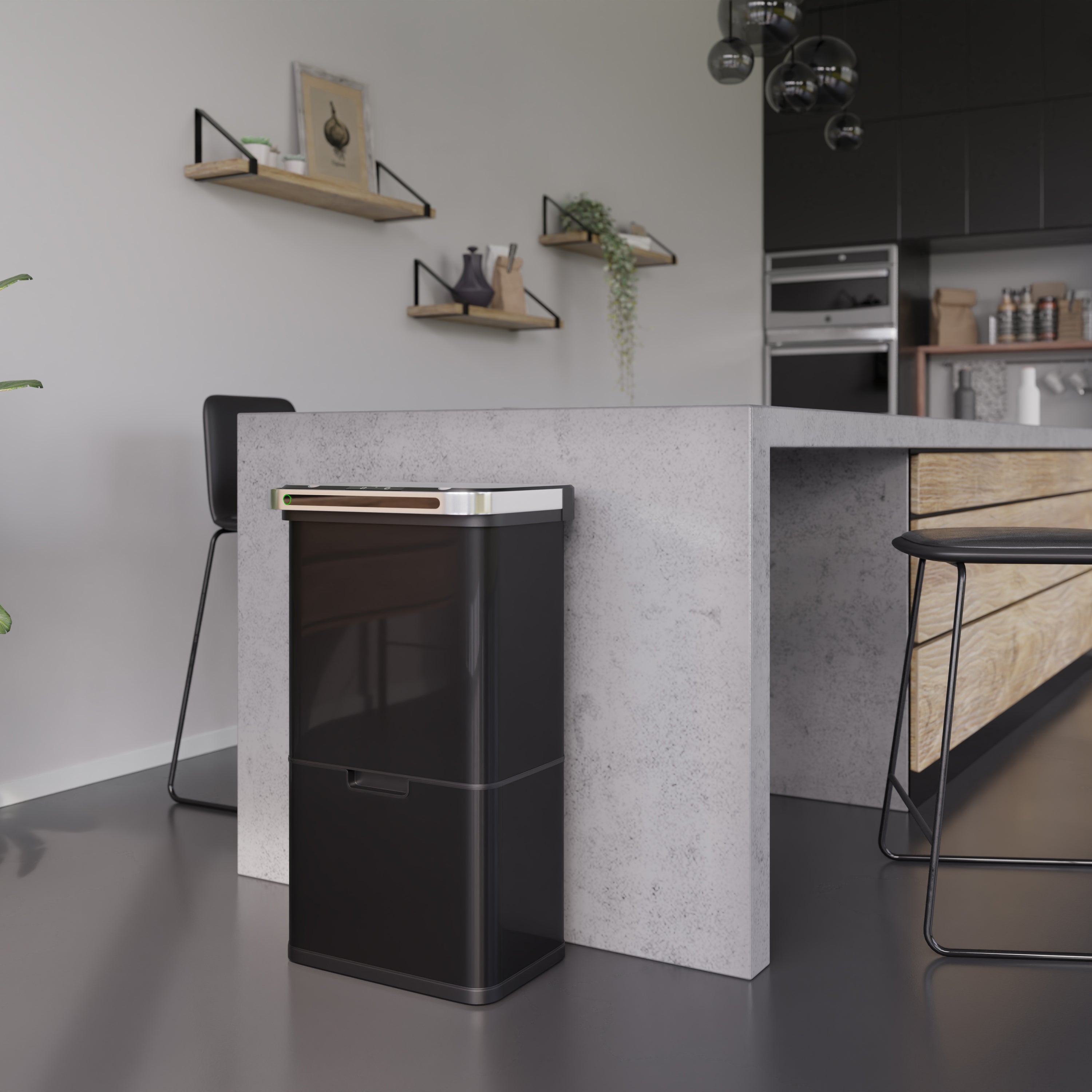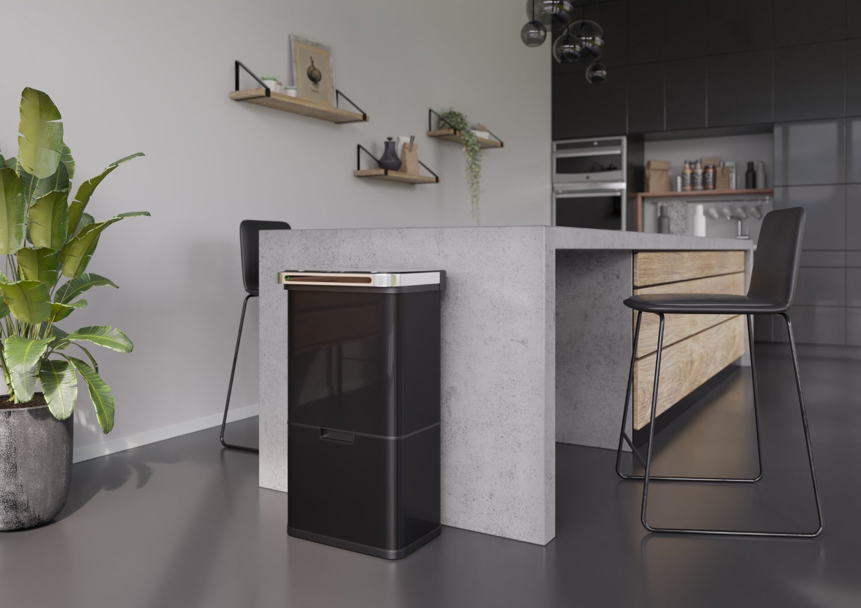 De #1 afvalscheidingsprullenbak met 60 liter inhoud (2×18L + 2×12L). Handig en hygiënisch in gebruik en met een luxe uitstraling.