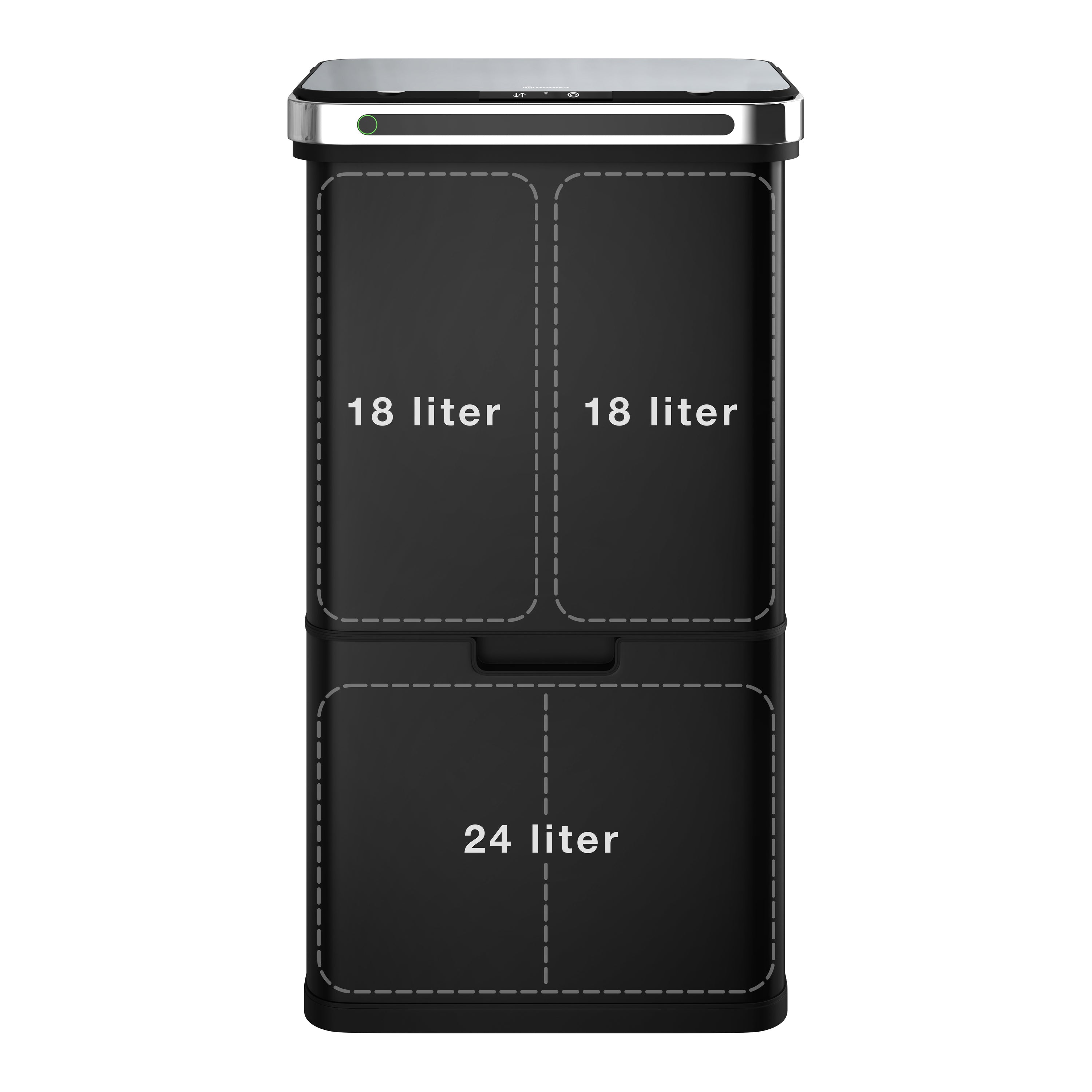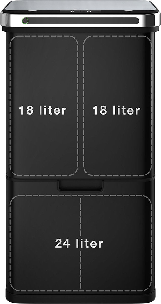 - MEERDERE COMPARTIMENTEN - Deze Dexer prullenbak bestaat uit 3 of 4 compartimenten. De bovenste 2 compartimenten bevatten een inhoud van 18 liter. Deze openen via een handsfree sensor. Een van deze bovenste compartimenten is voor groenafval en heeft een eigen deksel. In de schuiflade aan de onderzijde bevindt zich een compartiment van 24 liter. Deze is eenvoudig op te splitsen in 2 compartimenten van 12 liter door middel van een optionele scheidingswand. Ideaal voor het scheiden van afval!