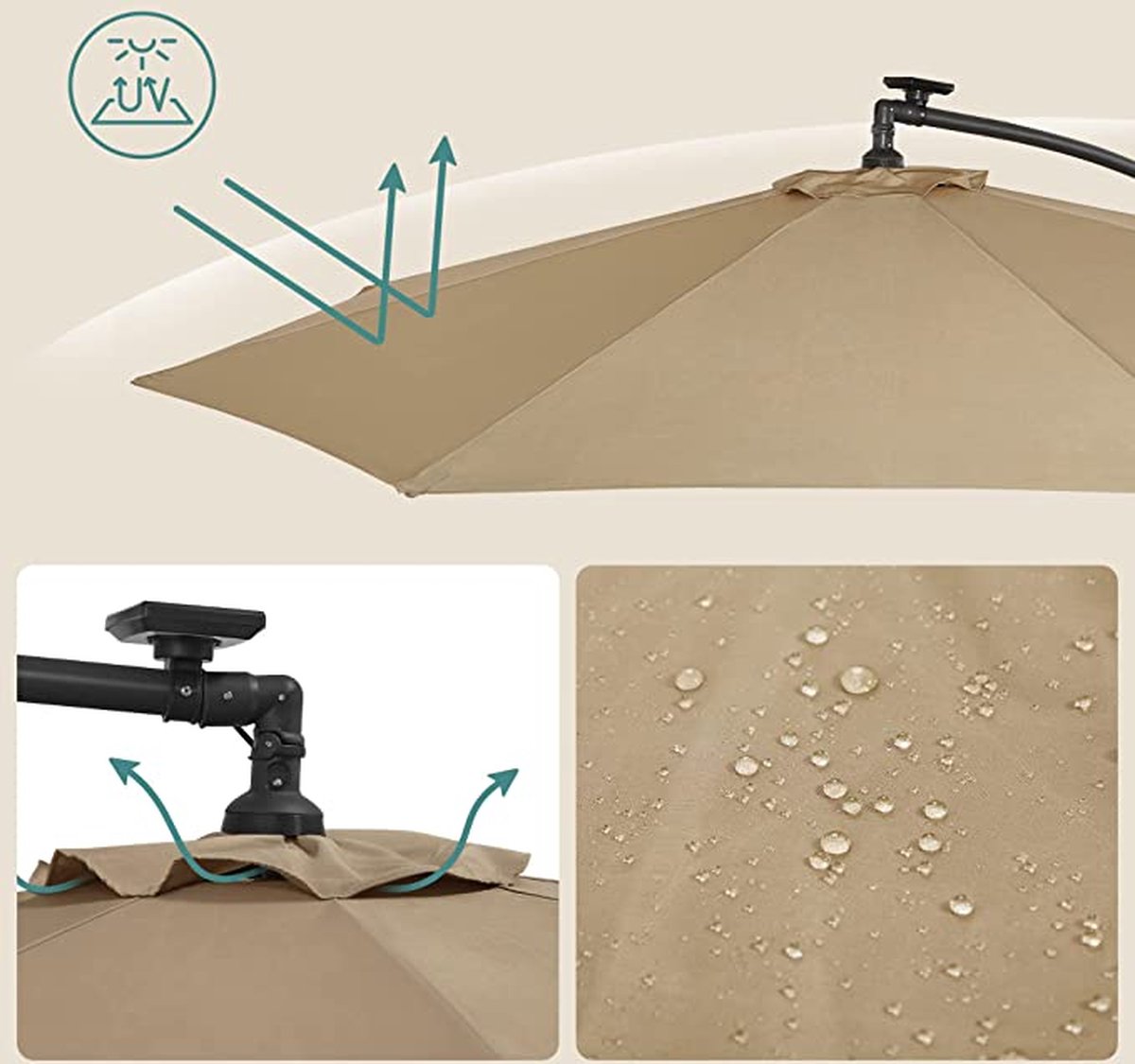 - De parasol is zeer eenvoudig te plaatsen en te bedienen via de zwendel. Plaats hem gemakkelijk en snel, waar en wanneer je wil!