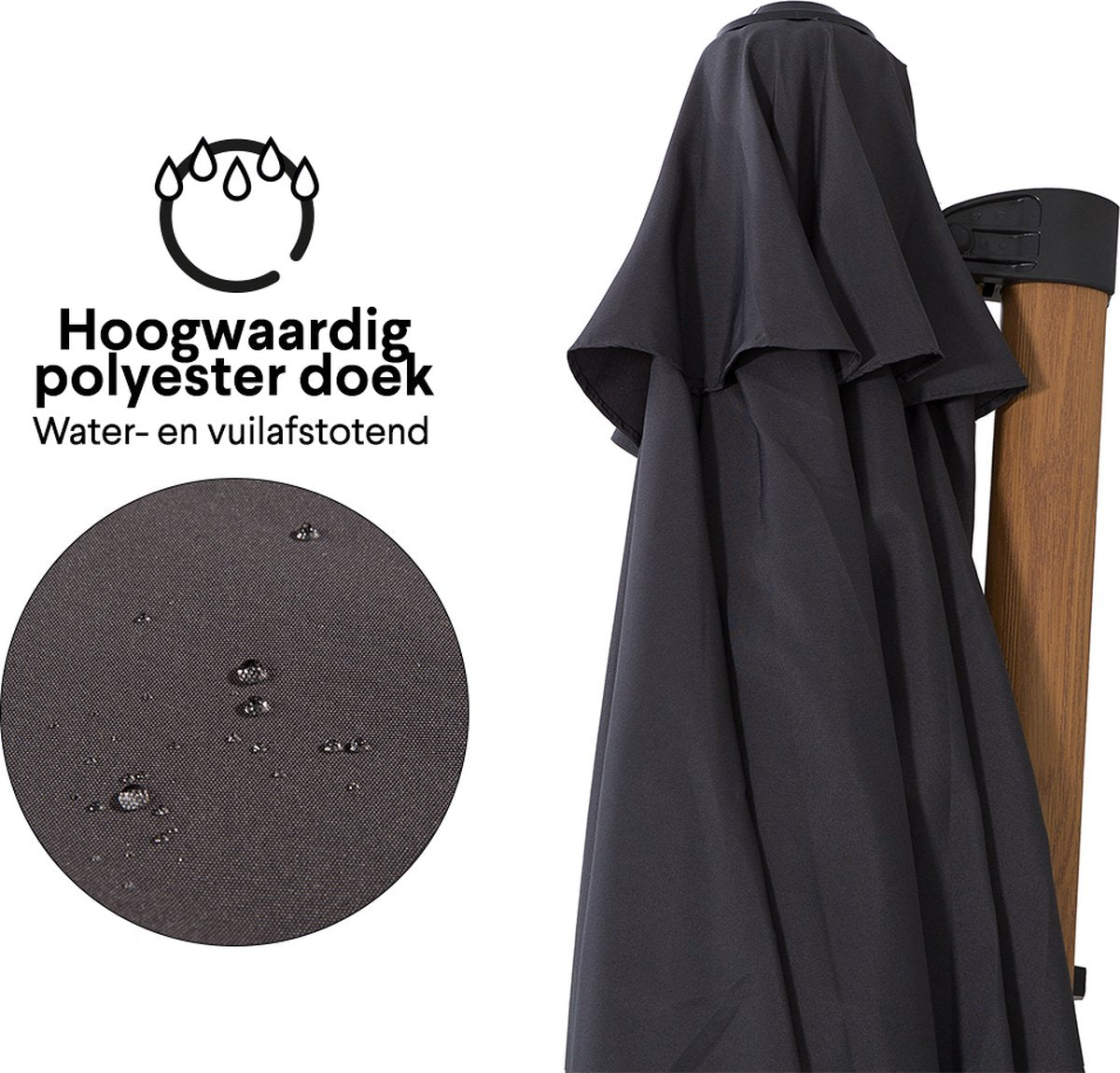 De Lux parasol bestaat uit duurzaam aluminium met houtlook en een polyester doek. Het grote ronde doek heeft een diameter van 300 cm, waardoor het tot 6 m² grond bedekt. Genoeg schaduw om met het hele gezin van te genieten! Het antraciet frame is gemaakt van duurzaam aluminium met een houten uiterlijk. Dit materiaal is erg stevig en heeft als bijkomend voordeel dat hij niet gaat roesten. Omdat dit frame helemaal aan de zijkant van het doek zit, is hij makkelijk te plaatsen en staat hij nooit in de weg. Deze parasol wordt geleverd met een beschermhoes. Zo voorkom je verkleuring van het polyester doek en blijft de parasol langer mooi! Voordelen van deze parasol