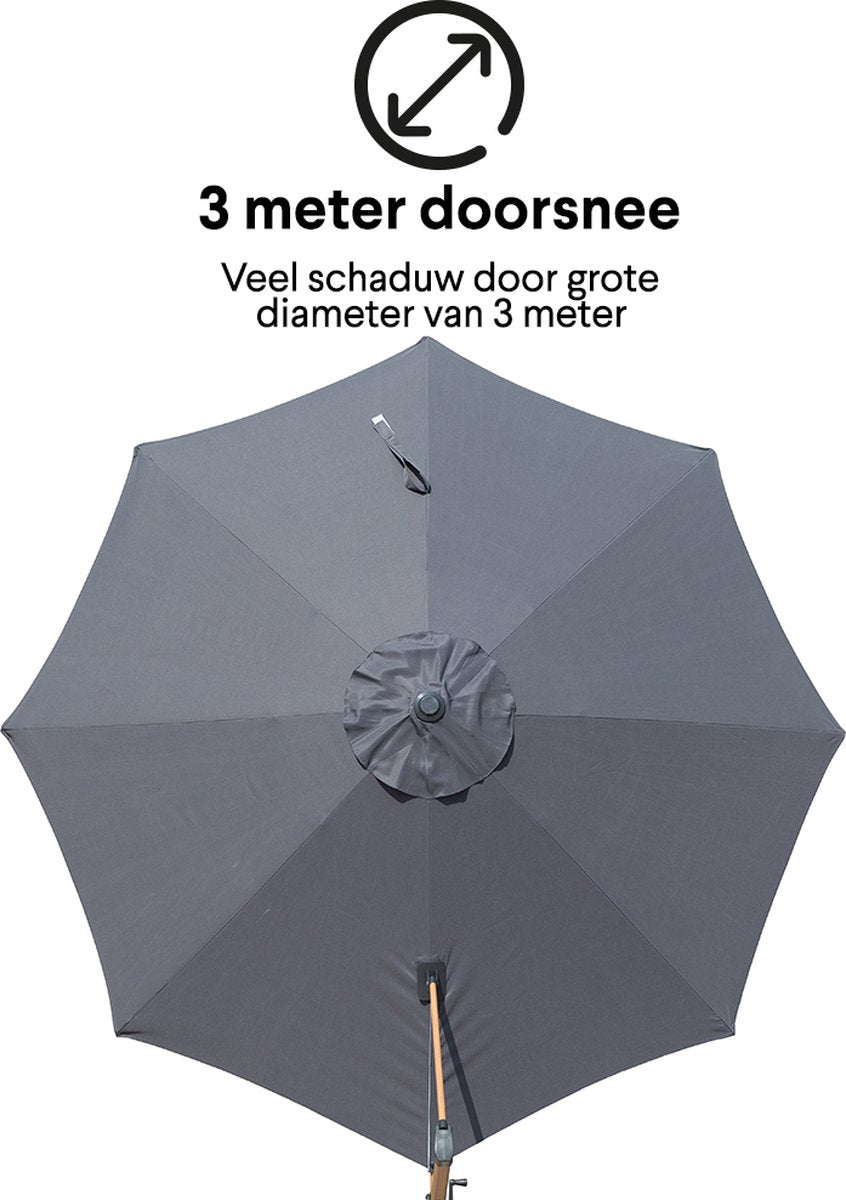 Deze parasol heeft een diameter van 3 meter en de kantelhoek is traploos te verstellen.
