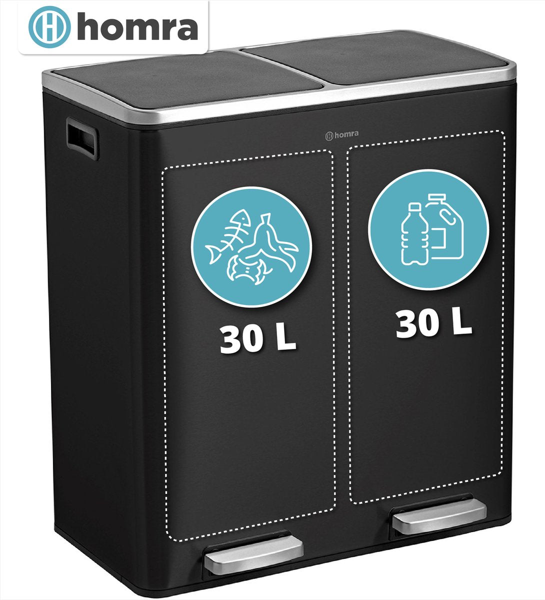 Mooie zwarte RVS afvalscheidingsprullenbak met 60 liter inhoud (2 x 30 liter). Handig en hygiënisch in gebruik en met een luxe uitstraling. Ideaal voor thuis en op kantoor! Voordelen van deze prullenbak