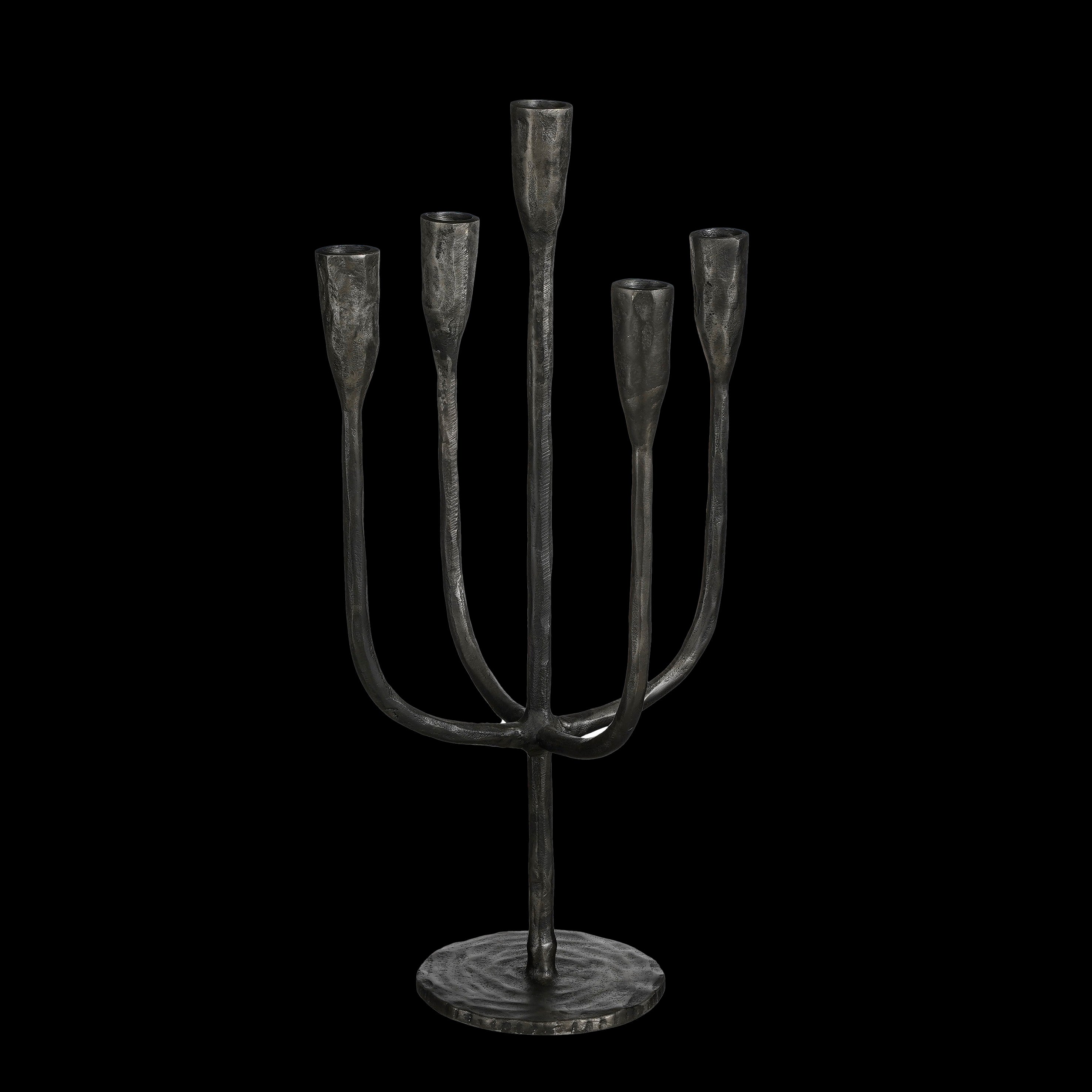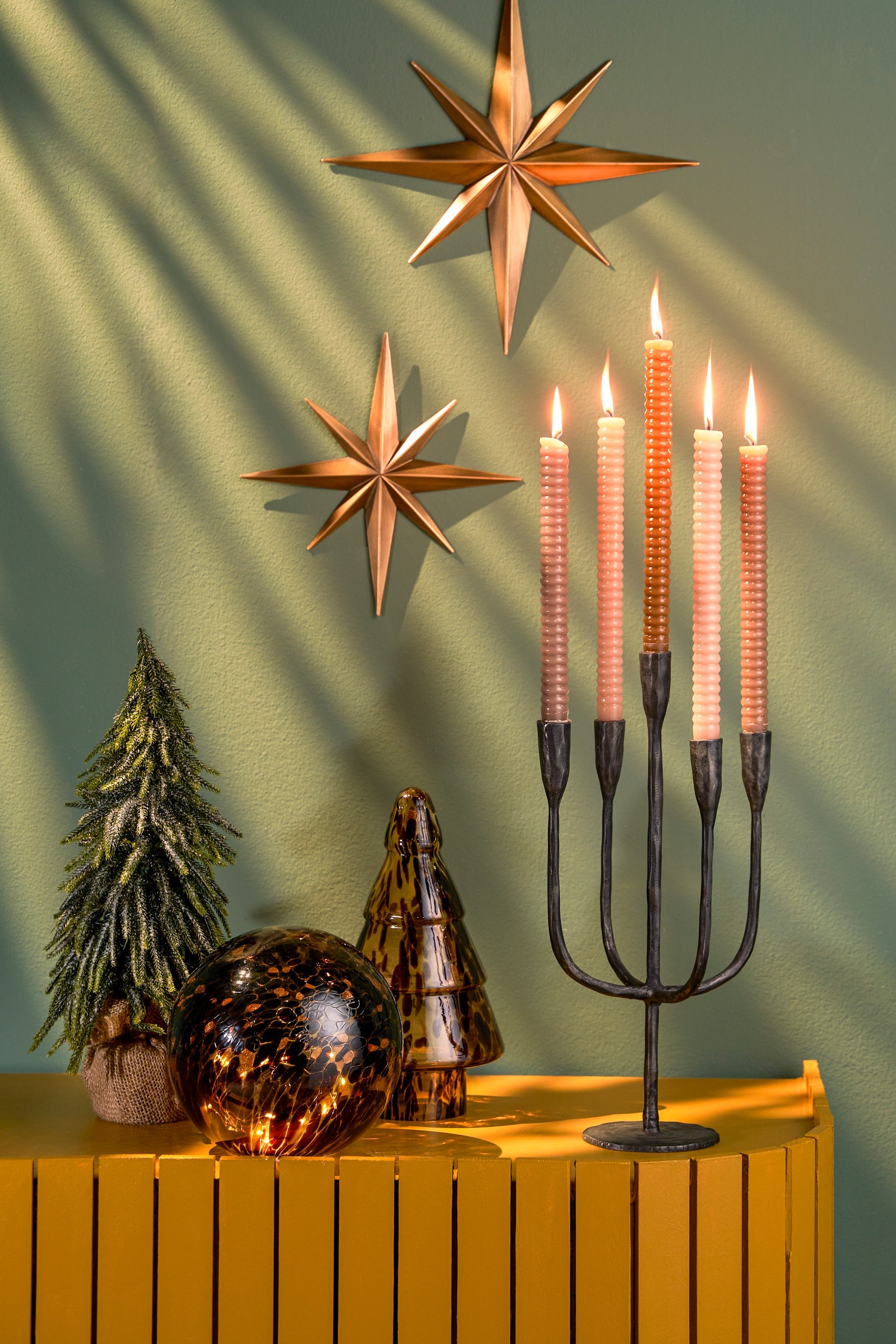 De Stretto kandelaar van House of Seasons heeft een klassiek design in een stoere, zwarte kleur. De vrij ruwe afwerking geeft hier een authentieke draai aan, waarin de Indiase roots goed zichtbaar zijn. Erg mooi voor op tafel, bijvoorbeeld tijdens het kerstdiner. Je kan maar liefst vijf dinerkaarsen in de kaarsenhouder kwijt met een diameter van 2,2 cm. De kandelaar is gemaakt van aluminium en heeft een afmeting van H43 x Ø22 cm.