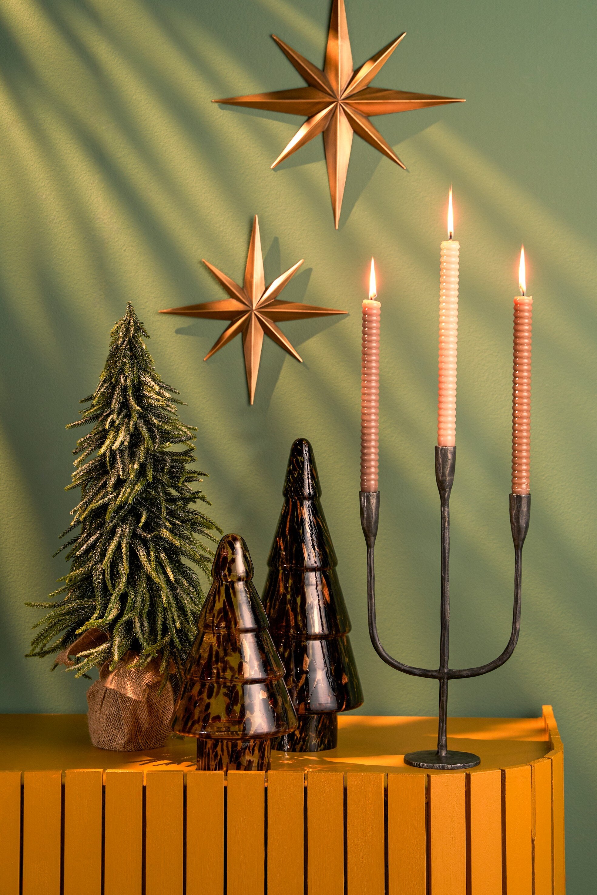 De Stretto kandelaar van House of Seasons heeft een klassiek design in een stoere, zwarte kleur. De vrij ruwe afwerking geeft hier een authentieke draai aan, waarin de Indiase roots goed zichtbaar zijn. Erg mooi voor op tafel, bijvoorbeeld tijdens het kerstdiner. Je kan drie dinerkaarsen in de kaarsenhouder kwijt met een diameter van 2,2 cm. De kandelaar is gemaakt van aluminium en heeft een afmeting van L21 x B9,5 x H40,5 cm.