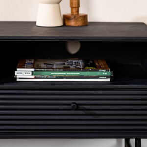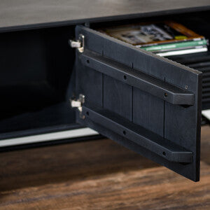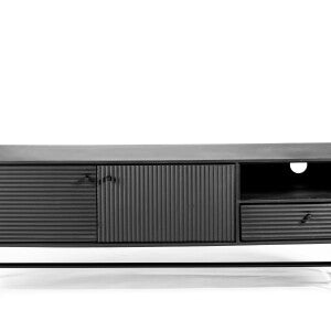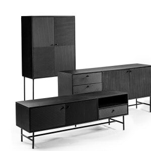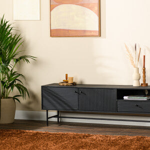 Dit trendy TV-meubel is gemaakt van hoogwaardig acaciahout en heeft een zwart metalen onderstel. Het meubels is naast dat het heel praktisch is ook nog is een echte eye-cachter bij jou in de woonkamer. De afwerking van de deurtjes met verschillende latjes zorgt voor een speels effect. Het TV-meubel heeft zowel open vak als gelosten deurtjes. Ideal dus om spullen in op te bergen. Dit meubel maakt deel uit van een serie en is ook te krijgen in een dressoir en wandkast. Handige informatie: - De afmetingen van het meubel zijn150x40x50cm - Alleen de poten moeten nog onder het meubel gemonteerd worden - Gemaakt van Acaciahout in een zwarte uitvoering - Staat mooi in verschillende stijlen