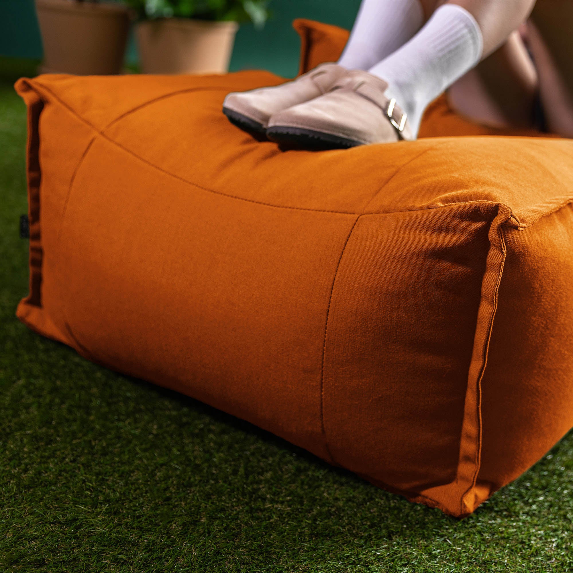 - Comfortabele zitzak met bijpassende poef, gemaakt van duurzame Olefin-stof – waterbestendig en geschikt voor buiten, met ingebouwde bekerhouder