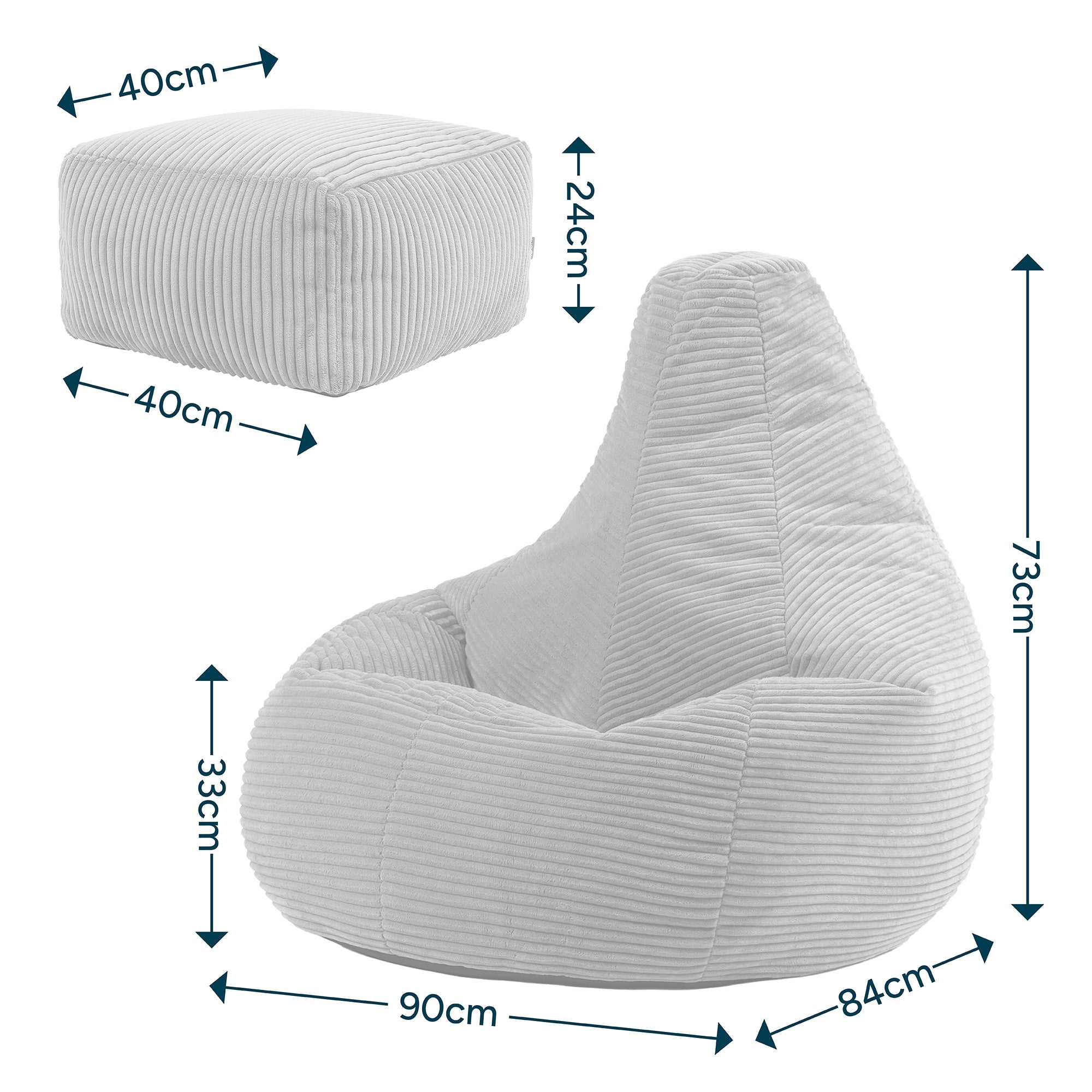 - Comfortabele zitzak met hoge rugleuning en bijpassende poef, gemaakt van het zachtste, OEKO-TEX-gecertificeerde ribfluweel