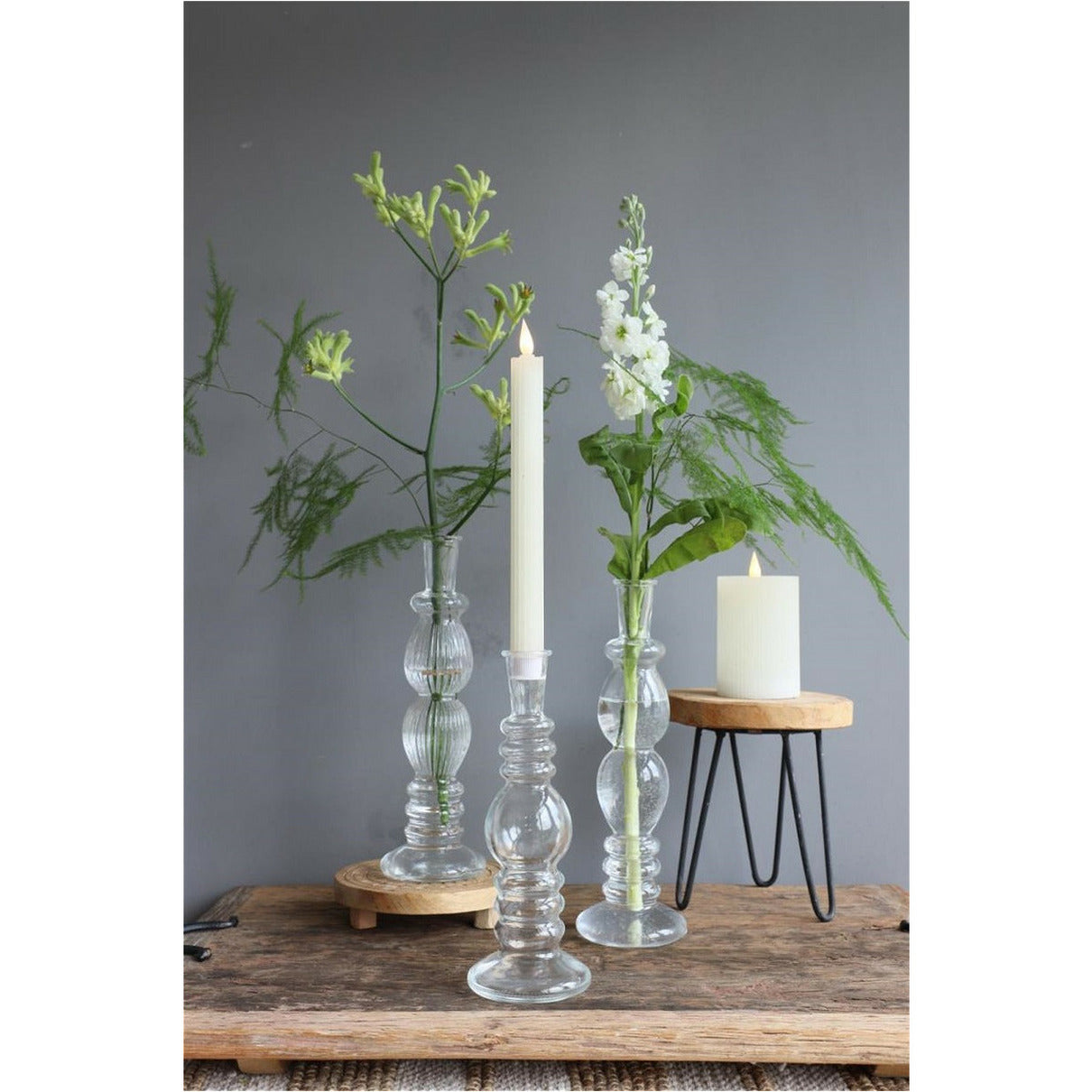 Zet verschillende smalle vaasjes met bloemen bij elkaar voor een fleurig geheel. Leuk detail: Je kunt deze vaas ook gebruiken als kaarsen kandelaar.