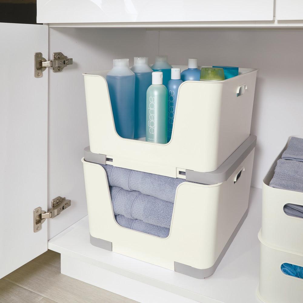 Stapelbare Opbergbox met Opening, 39 x 23 cm, Kunststof, Beige/Grijs – iDesign | Eco Storage Creëer eenvoudig alle opbergruimte die je nodig hebt met deze handige, stapelbare opbergbox uit de Eco Storage serie van iDesign. De opbergbox is gemaakt van kunststof waardoor deze makkelijk schoon te maken is. De afmetingen van deze stapelbare opbergbox zijn 39 x 39 x 23 centimeter. Door de uitschuifbare voet aan de onderkant van de opbergbox is het mogelijk deze eenvoudig te stapelen. Aan de voorkant van de opbergbox zit een ruime opening waardoor je eenvoudig bij al je spullen kunt en ook eenvoudig je spullen zoals de was, speelgoed of kleden op kunt bergen in de opbergbox. Combineer deze opbergbox met de andere handige opbergartikelen uit de Eco Storage serie van iDesign voor een opgeruimde en georganiseerde setting in iedere ruimte! Pluspunten