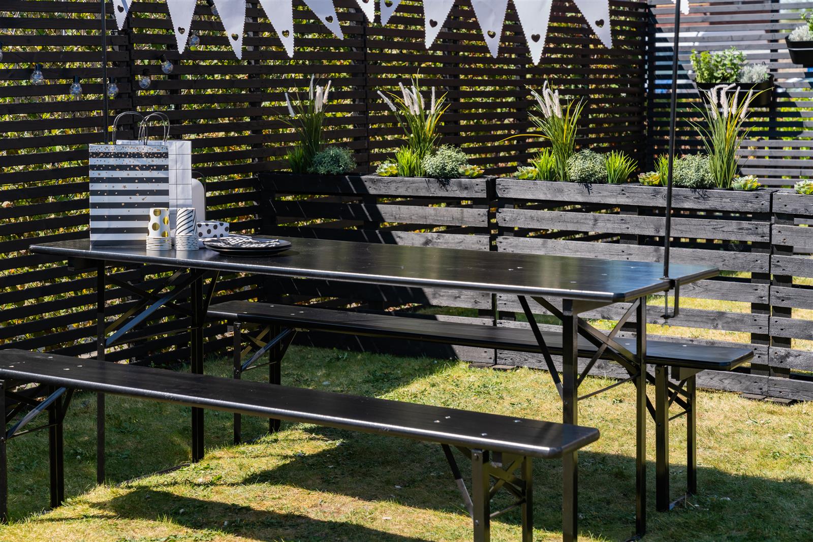 Waarom worden wij zo blij van deze zwarte bank? - Binnen 2 minuten heb je de tafel staan en berg je hem weer op - Unieke kleur zwart - Ideaal voor feestjes, vergaderingen of als flexibele werkplek - Eenvoudig schoon te houden door de gladde verlijmde zitting