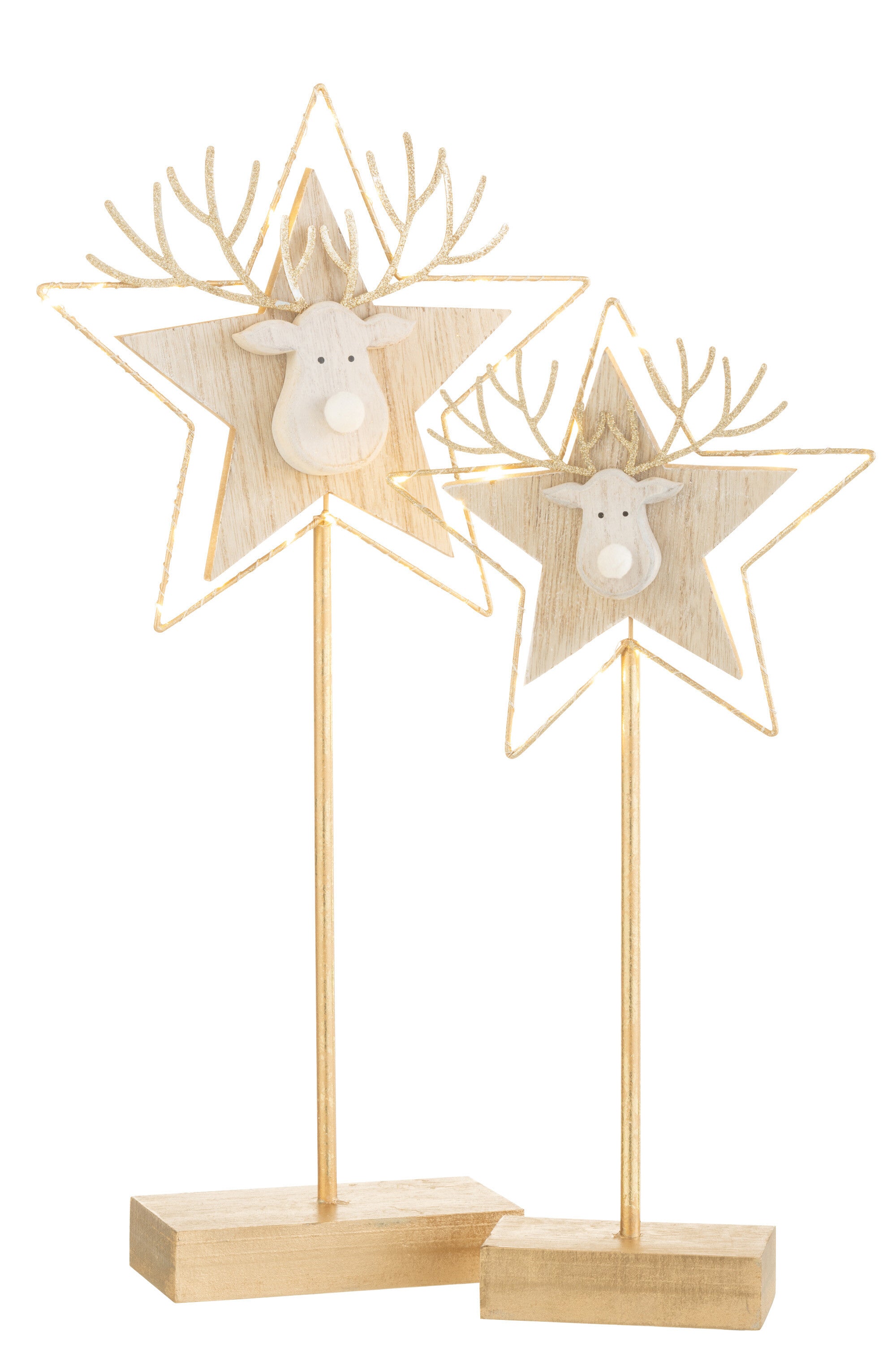 J-Line decoratie Rendier|Ster op voet - hout - goud|wit - LED - large