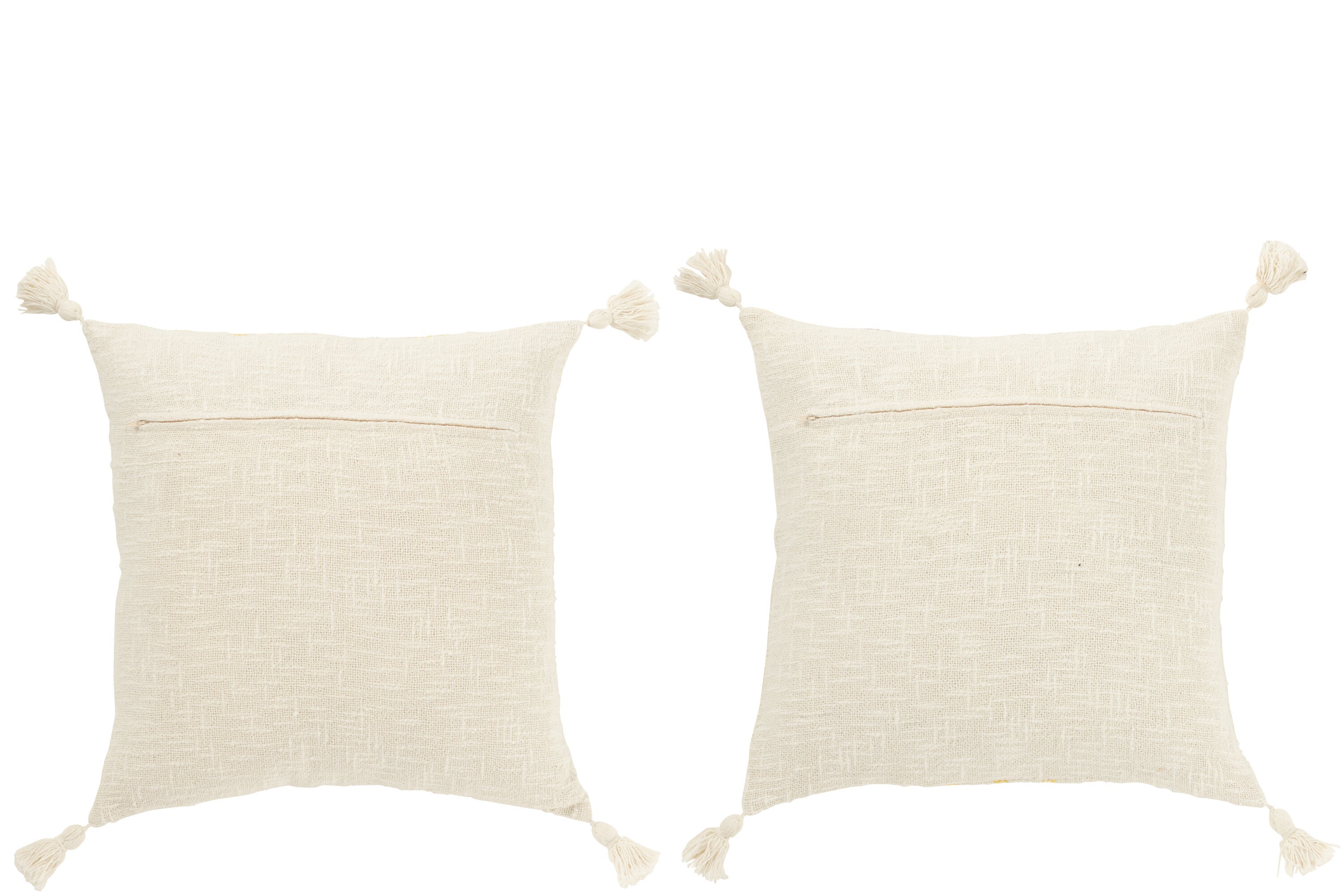 J-Line kussen Vierkant Strepen + Kwasten - katoen - wit|geel - 2 stuks