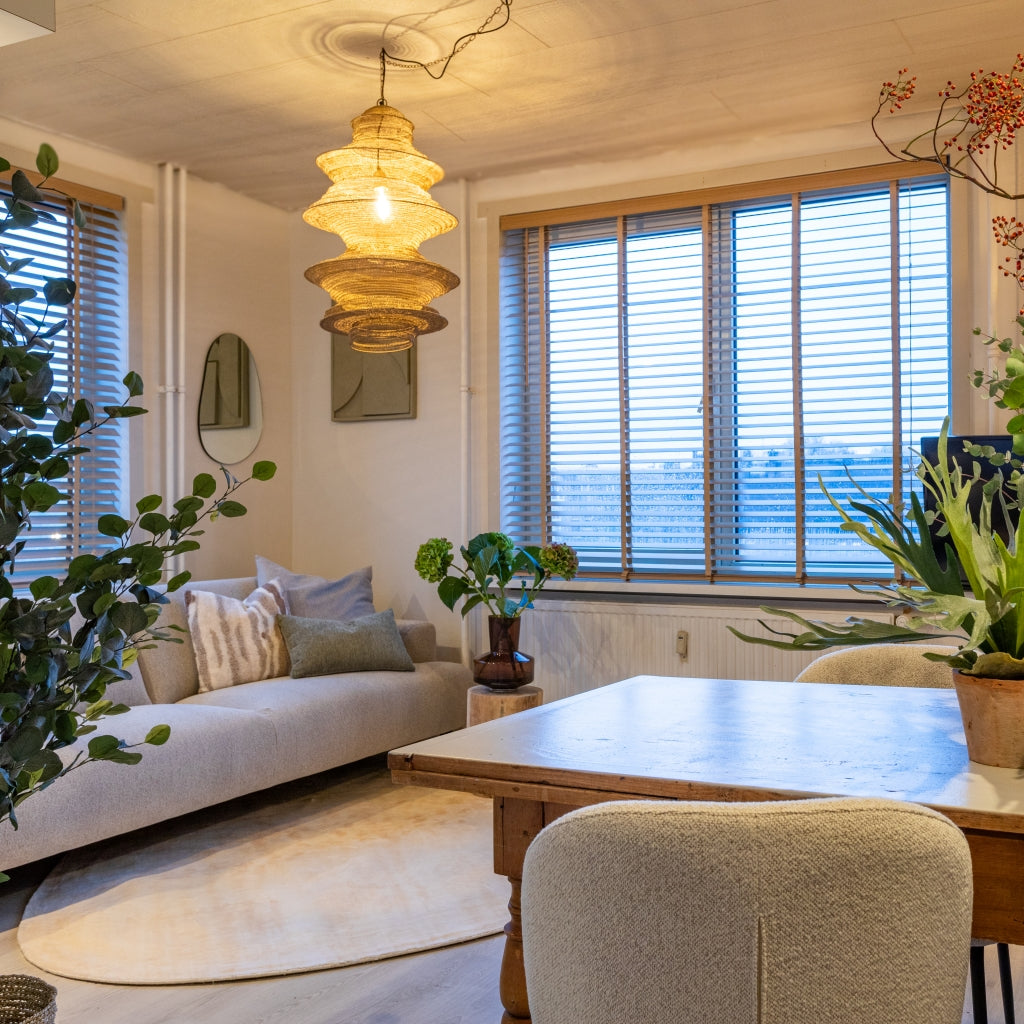 De lindehouten jaloezie in naturel tint straalt warmte uit met zijn natuurlijke uitstraling. Bovenop bevindt zich een aluminium cassette met een afdeklat, voorzien van een luxueus profiel voor een verfijnde afwerking. Zelfs de bedieningskoorden en verticale ladderbanden zijn in een bijpassende kleur, waardoor de jaloezie perfect opgaat in dezelfde warme naturel kleur. De ladderbanden, met een breedte van 25 mm, hebben een prachtige geweven structuur. Stylen met een naturel houten jaloezie: Hout never goes out of fashion! De gezellige sfeer van een houten jaloezie past perfect bij verschillende interieurtrends. Denk aan een inrichting met warme terra en zachte bruintinten, samen met veel groene planten. Hout komt ook goed tot zijn recht in een stoere, industriële setting. De combinatie van hout met zwart vormt dan de ideale basis. Pluspunten: • Scherpe prijs voor perfecte kwaliteit en afwerking • Op en neer beweging door bedieningskoorden • Draaistang om te kantelen • Ophangsteunen voor eenvoudig montage • Makkelijk in te korten • Leverbaar in veel standaardmaten (60 tot 220 cm breed) • In 2 trendy hout kleuren en basic zwart en wit leverbaar Minpunten: • Verduistert niet volledig • Niet geschikt voor vochtige ruimtes, zoals een badkamer Welke maat heb ik nodig? Bedenk van tevoren of je de jaloezie "in of op de dag" wilt hangen, dus in of op het kozijn. Wanneer je ze in de dag hangt, heb je geen last van de zijkanten die na het versmallen onafgewerkt zullen zijn. Dat zit dan mooi verborgen. Het voordeel van op de dag monteren is dat het beter verduistert dan in de dag montage. Let op: het inmeten is een secuur klusje. We adviseren om altijd 2x te meten om vergissingen te voorkomen. Montage op de dag (op het plafond of vlak boven het raam) 1. Meet voor de breedte het raam op 3 plaatsen 2. Voeg daar aan beide kanten 5 cm extra aan toe 3. Meet voor de lengte de hoogte tot aan de vensterbank of tot aan de vloer. Houd rekening met de hoogte van het ophangsysteem 4. Trek hier 1 cm vanaf Montage in de dag (tussen de kozijnen) 1. Houd rekening met draaiende en uitstekende delen, zoals hendels en grepen 2. Meet de breedte tussen het kozijn of de muren op 3 plaatsen 3. De breedte is de smalst gemeten maat. Trek hier 1 cm vanaf 4. Meet de lengte tussen het kozijn of muur en de vensterbank op 3 plaatsen 5. De lengte is de kortst gemeten maat. Indien je de jaloezie tot op de vensterbank wilt, trek er dan 1 cm vanaf Eenvoudige montage: 1. Volg eerst bovenstaande stappen voor het correct meten van de juiste maat jaloezie. 2. Meet en teken de plaats af waar de ophangsteunen moeten komen 3. Zorg dat er genoeg speling is voor wanneer je de cassette met jaloezie in de steunen hangt. 4. Hang de extra beugel ter ondersteuning op, maar niet in het midden. Anders zit deze beugel op dezelfde plek als het ladderband. 5. Hang de jaloezie op door de cassette in de ophangsteunen te hangen en klik deze dicht. 6. Bevestig de ophangbeugels aan de afdeklat en schuif de afdeklat met beugels op de cassette. Je kunt gebruik maken van het dubbelzijdige tape om de afdeklat vast te maken. 7. Indien nodig kun je de lengte van de jaloezie inkorten (zie onderstaande stappen). Lengte jaloezie inkorten: 1. Hang de jaloezie languit naar beneden bij het op maat maken van de lengte. Zo kun je goed bepalen hoeveel lamellen er tussenuit moeten voor de juiste lengte. 2. Aan de onderzijde zitten doppen ter afwerking van het katoenen ladderband en het koord. Deze doppen kun je er makkelijk met je vingers of anders met een platte schroevendraaier uitduwen. 3. Na het weghalen van de doppen worden de knoopjes van de koorden zichtbaar. Het is soms even friemelen, maar haal de knopen los. 4. Nu zie je vaak meteen hoeveel lamellen er tussenuit moeten. Verwijder eerst de onderste, wat bredere, afwerk lamel en daarna het teveel aan lamellen. Schuif de brede afwerklamel weer tussen het ladderband en rijg het koord er doorheen. Maak de knoopjes opnieuw vast. 5. Knip het ladderband op de juiste lengte af. Zorg ervoor dat je dat niet te kort doet. Check onderaan even hoe dat eerder gedaan is en knip op dezelfde wijze het teveel aan band af. Plaats het ladderband met de doppen weer terug in de afwerk lamel, precies zoals het eerst zat. 6. Als finishing touch kun je ook het bedieningskoord op de juiste lengte maken. Duw de houten klosjes omhoog en knoop het koord hoger (op de juiste lengte) weer vast. Knip het overtollige koord aan de onderkant af en duw de klosjes weer terug naar beneden over de knoopjes heen. Nu is de look helemaal af. Onderhoud: Om je houten jaloezie in topvorm te houden is regelmatig onderhoud belangrijk. Om ze snel op te frissen gebruik je een stofdoek, plumeau of de stofzuiger. Draai de jaloezieën dicht en ga er met een stofdoek of plumeau overheen. Het kan ook met de stofzuiger, zet ‘m dan wel op de laagste stand en gebruik een kleine opzetborstel. Voor een wat diepere reiniging kun je de lamellen afnemen met een licht vochtige doek en een zacht reinigingsmiddel.| Afmetingen | |
