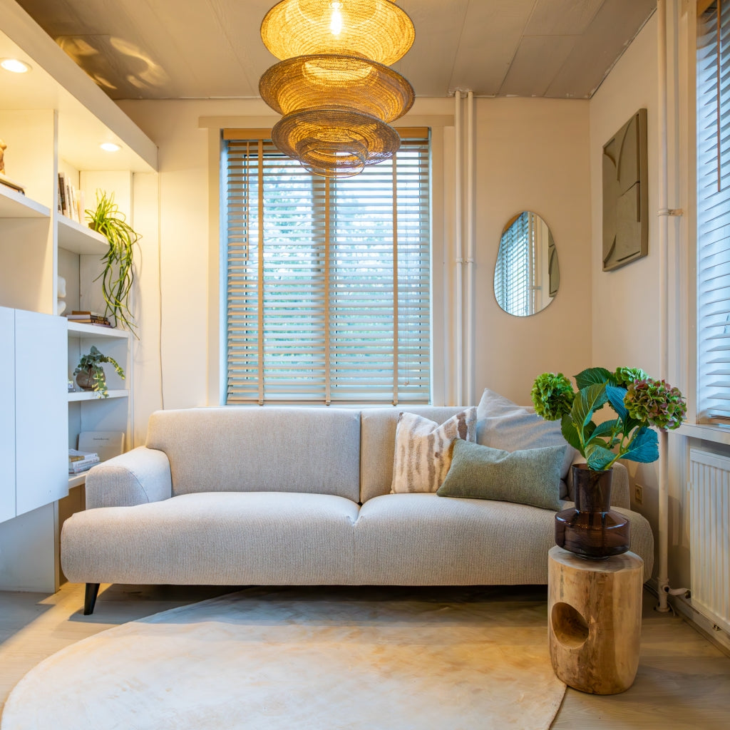 De lindehouten jaloezie in naturel tint straalt warmte uit met zijn natuurlijke uitstraling. Bovenop bevindt zich een aluminium cassette met een afdeklat, voorzien van een luxueus profiel voor een verfijnde afwerking. Zelfs de bedieningskoorden en verticale ladderbanden zijn in een bijpassende kleur, waardoor de jaloezie perfect opgaat in dezelfde warme naturel kleur. De ladderbanden, met een breedte van 25 mm, hebben een prachtige geweven structuur. Stylen met een naturel houten jaloezie: Hout never goes out of fashion! De gezellige sfeer van een houten jaloezie past perfect bij verschillende interieurtrends. Denk aan een inrichting met warme terra en zachte bruintinten, samen met veel groene planten. Hout komt ook goed tot zijn recht in een stoere, industriële setting. De combinatie van hout met zwart vormt dan de ideale basis. Pluspunten: • Scherpe prijs voor perfecte kwaliteit en afwerking • Op en neer beweging door bedieningskoorden • Draaistang om te kantelen • Ophangsteunen voor eenvoudig montage • Makkelijk in te korten • Leverbaar in veel standaardmaten (60 tot 220 cm breed) • In 2 trendy hout kleuren en basic zwart en wit leverbaar Minpunten: • Verduistert niet volledig • Niet geschikt voor vochtige ruimtes, zoals een badkamer Welke maat heb ik nodig? Bedenk van tevoren of je de jaloezie "in of op de dag" wilt hangen, dus in of op het kozijn. Wanneer je ze in de dag hangt, heb je geen last van de zijkanten die na het versmallen onafgewerkt zullen zijn. Dat zit dan mooi verborgen. Het voordeel van op de dag monteren is dat het beter verduistert dan in de dag montage. Let op: het inmeten is een secuur klusje. We adviseren om altijd 2x te meten om vergissingen te voorkomen. Montage op de dag (op het plafond of vlak boven het raam) 1. Meet voor de breedte het raam op 3 plaatsen 2. Voeg daar aan beide kanten 5 cm extra aan toe 3. Meet voor de lengte de hoogte tot aan de vensterbank of tot aan de vloer. Houd rekening met de hoogte van het ophangsysteem 4. Trek hier 1 cm vanaf Montage in de dag (tussen de kozijnen) 1. Houd rekening met draaiende en uitstekende delen, zoals hendels en grepen 2. Meet de breedte tussen het kozijn of de muren op 3 plaatsen 3. De breedte is de smalst gemeten maat. Trek hier 1 cm vanaf 4. Meet de lengte tussen het kozijn of muur en de vensterbank op 3 plaatsen 5. De lengte is de kortst gemeten maat. Indien je de jaloezie tot op de vensterbank wilt, trek er dan 1 cm vanaf Eenvoudige montage: 1. Volg eerst bovenstaande stappen voor het correct meten van de juiste maat jaloezie. 2. Meet en teken de plaats af waar de ophangsteunen moeten komen 3. Zorg dat er genoeg speling is voor wanneer je de cassette met jaloezie in de steunen hangt. 4. Hang de extra beugel ter ondersteuning op, maar niet in het midden. Anders zit deze beugel op dezelfde plek als het ladderband. 5. Hang de jaloezie op door de cassette in de ophangsteunen te hangen en klik deze dicht. 6. Bevestig de ophangbeugels aan de afdeklat en schuif de afdeklat met beugels op de cassette. Je kunt gebruik maken van het dubbelzijdige tape om de afdeklat vast te maken. 7. Indien nodig kun je de lengte van de jaloezie inkorten (zie onderstaande stappen). Lengte jaloezie inkorten: 1. Hang de jaloezie languit naar beneden bij het op maat maken van de lengte. Zo kun je goed bepalen hoeveel lamellen er tussenuit moeten voor de juiste lengte. 2. Aan de onderzijde zitten doppen ter afwerking van het katoenen ladderband en het koord. Deze doppen kun je er makkelijk met je vingers of anders met een platte schroevendraaier uitduwen. 3. Na het weghalen van de doppen worden de knoopjes van de koorden zichtbaar. Het is soms even friemelen, maar haal de knopen los. 4. Nu zie je vaak meteen hoeveel lamellen er tussenuit moeten. Verwijder eerst de onderste, wat bredere, afwerk lamel en daarna het teveel aan lamellen. Schuif de brede afwerklamel weer tussen het ladderband en rijg het koord er doorheen. Maak de knoopjes opnieuw vast. 5. Knip het ladderband op de juiste lengte af. Zorg ervoor dat je dat niet te kort doet. Check onderaan even hoe dat eerder gedaan is en knip op dezelfde wijze het teveel aan band af. Plaats het ladderband met de doppen weer terug in de afwerk lamel, precies zoals het eerst zat. 6. Als finishing touch kun je ook het bedieningskoord op de juiste lengte maken. Duw de houten klosjes omhoog en knoop het koord hoger (op de juiste lengte) weer vast. Knip het overtollige koord aan de onderkant af en duw de klosjes weer terug naar beneden over de knoopjes heen. Nu is de look helemaal af. Onderhoud: Om je houten jaloezie in topvorm te houden is regelmatig onderhoud belangrijk. Om ze snel op te frissen gebruik je een stofdoek, plumeau of de stofzuiger. Draai de jaloezieën dicht en ga er met een stofdoek of plumeau overheen. Het kan ook met de stofzuiger, zet ‘m dan wel op de laagste stand en gebruik een kleine opzetborstel. Voor een wat diepere reiniging kun je de lamellen afnemen met een licht vochtige doek en een zacht reinigingsmiddel.| Afmetingen | |