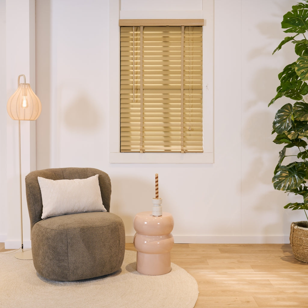 De lindehouten jaloezie in naturel tint straalt warmte uit met zijn natuurlijke uitstraling. Bovenop bevindt zich een aluminium cassette met een afdeklat, voorzien van een luxueus profiel voor een verfijnde afwerking. Zelfs de bedieningskoorden en verticale ladderbanden zijn in een bijpassende kleur, waardoor de jaloezie perfect opgaat in dezelfde warme naturel kleur. De ladderbanden, met een breedte van 25 mm, hebben een prachtige geweven structuur. Stylen met een naturel houten jaloezie: Hout never goes out of fashion! De gezellige sfeer van een houten jaloezie past perfect bij verschillende interieurtrends. Denk aan een inrichting met warme terra en zachte bruintinten, samen met veel groene planten. Hout komt ook goed tot zijn recht in een stoere, industriële setting. De combinatie van hout met zwart vormt dan de ideale basis. Pluspunten: • Scherpe prijs voor perfecte kwaliteit en afwerking • Op en neer beweging door bedieningskoorden • Draaistang om te kantelen • Ophangsteunen voor eenvoudig montage • Makkelijk in te korten • Leverbaar in veel standaardmaten (60 tot 220 cm breed) • In 2 trendy hout kleuren en basic zwart en wit leverbaar Minpunten: • Verduistert niet volledig • Niet geschikt voor vochtige ruimtes, zoals een badkamer Welke maat heb ik nodig? Bedenk van tevoren of je de jaloezie "in of op de dag" wilt hangen, dus in of op het kozijn. Wanneer je ze in de dag hangt, heb je geen last van de zijkanten die na het versmallen onafgewerkt zullen zijn. Dat zit dan mooi verborgen. Het voordeel van op de dag monteren is dat het beter verduistert dan in de dag montage. Let op: het inmeten is een secuur klusje. We adviseren om altijd 2x te meten om vergissingen te voorkomen. Montage op de dag (op het plafond of vlak boven het raam) 1. Meet voor de breedte het raam op 3 plaatsen 2. Voeg daar aan beide kanten 5 cm extra aan toe 3. Meet voor de lengte de hoogte tot aan de vensterbank of tot aan de vloer. Houd rekening met de hoogte van het ophangsysteem 4. Trek hier 1 cm vanaf Montage in de dag (tussen de kozijnen) 1. Houd rekening met draaiende en uitstekende delen, zoals hendels en grepen 2. Meet de breedte tussen het kozijn of de muren op 3 plaatsen 3. De breedte is de smalst gemeten maat. Trek hier 1 cm vanaf 4. Meet de lengte tussen het kozijn of muur en de vensterbank op 3 plaatsen 5. De lengte is de kortst gemeten maat. Indien je de jaloezie tot op de vensterbank wilt, trek er dan 1 cm vanaf Eenvoudige montage: 1. Volg eerst bovenstaande stappen voor het correct meten van de juiste maat jaloezie. 2. Meet en teken de plaats af waar de ophangsteunen moeten komen 3. Zorg dat er genoeg speling is voor wanneer je de cassette met jaloezie in de steunen hangt. 4. Hang de extra beugel ter ondersteuning op, maar niet in het midden. Anders zit deze beugel op dezelfde plek als het ladderband. 5. Hang de jaloezie op door de cassette in de ophangsteunen te hangen en klik deze dicht. 6. Bevestig de ophangbeugels aan de afdeklat en schuif de afdeklat met beugels op de cassette. Je kunt gebruik maken van het dubbelzijdige tape om de afdeklat vast te maken. 7. Indien nodig kun je de lengte van de jaloezie inkorten (zie onderstaande stappen). Lengte jaloezie inkorten: 1. Hang de jaloezie languit naar beneden bij het op maat maken van de lengte. Zo kun je goed bepalen hoeveel lamellen er tussenuit moeten voor de juiste lengte. 2. Aan de onderzijde zitten doppen ter afwerking van het katoenen ladderband en het koord. Deze doppen kun je er makkelijk met je vingers of anders met een platte schroevendraaier uitduwen. 3. Na het weghalen van de doppen worden de knoopjes van de koorden zichtbaar. Het is soms even friemelen, maar haal de knopen los. 4. Nu zie je vaak meteen hoeveel lamellen er tussenuit moeten. Verwijder eerst de onderste, wat bredere, afwerk lamel en daarna het teveel aan lamellen. Schuif de brede afwerklamel weer tussen het ladderband en rijg het koord er doorheen. Maak de knoopjes opnieuw vast. 5. Knip het ladderband op de juiste lengte af. Zorg ervoor dat je dat niet te kort doet. Check onderaan even hoe dat eerder gedaan is en knip op dezelfde wijze het teveel aan band af. Plaats het ladderband met de doppen weer terug in de afwerk lamel, precies zoals het eerst zat. 6. Als finishing touch kun je ook het bedieningskoord op de juiste lengte maken. Duw de houten klosjes omhoog en knoop het koord hoger (op de juiste lengte) weer vast. Knip het overtollige koord aan de onderkant af en duw de klosjes weer terug naar beneden over de knoopjes heen. Nu is de look helemaal af. Onderhoud: Om je houten jaloezie in topvorm te houden is regelmatig onderhoud belangrijk. Om ze snel op te frissen gebruik je een stofdoek, plumeau of de stofzuiger. Draai de jaloezieën dicht en ga er met een stofdoek of plumeau overheen. Het kan ook met de stofzuiger, zet ‘m dan wel op de laagste stand en gebruik een kleine opzetborstel. Voor een wat diepere reiniging kun je de lamellen afnemen met een licht vochtige doek en een zacht reinigingsmiddel.| Afmetingen | |