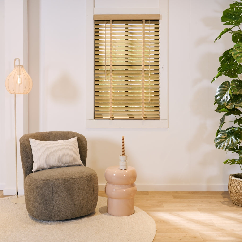 De lindehouten jaloezie in naturel tint straalt warmte uit met zijn natuurlijke uitstraling. Bovenop bevindt zich een aluminium cassette met een afdeklat, voorzien van een luxueus profiel voor een verfijnde afwerking. Zelfs de bedieningskoorden en verticale ladderbanden zijn in een bijpassende kleur, waardoor de jaloezie perfect opgaat in dezelfde warme naturel kleur. De ladderbanden, met een breedte van 25 mm, hebben een prachtige geweven structuur. Stylen met een naturel houten jaloezie: Hout never goes out of fashion! De gezellige sfeer van een houten jaloezie past perfect bij verschillende interieurtrends. Denk aan een inrichting met warme terra en zachte bruintinten, samen met veel groene planten. Hout komt ook goed tot zijn recht in een stoere, industriële setting. De combinatie van hout met zwart vormt dan de ideale basis. Pluspunten: • Scherpe prijs voor perfecte kwaliteit en afwerking • Op en neer beweging door bedieningskoorden • Draaistang om te kantelen • Ophangsteunen voor eenvoudig montage • Makkelijk in te korten • Leverbaar in veel standaardmaten (60 tot 220 cm breed) • In 2 trendy hout kleuren en basic zwart en wit leverbaar Minpunten: • Verduistert niet volledig • Niet geschikt voor vochtige ruimtes, zoals een badkamer Welke maat heb ik nodig? Bedenk van tevoren of je de jaloezie "in of op de dag" wilt hangen, dus in of op het kozijn. Wanneer je ze in de dag hangt, heb je geen last van de zijkanten die na het versmallen onafgewerkt zullen zijn. Dat zit dan mooi verborgen. Het voordeel van op de dag monteren is dat het beter verduistert dan in de dag montage. Let op: het inmeten is een secuur klusje. We adviseren om altijd 2x te meten om vergissingen te voorkomen. Montage op de dag (op het plafond of vlak boven het raam) 1. Meet voor de breedte het raam op 3 plaatsen 2. Voeg daar aan beide kanten 5 cm extra aan toe 3. Meet voor de lengte de hoogte tot aan de vensterbank of tot aan de vloer. Houd rekening met de hoogte van het ophangsysteem 4. Trek hier 1 cm vanaf Montage in de dag (tussen de kozijnen) 1. Houd rekening met draaiende en uitstekende delen, zoals hendels en grepen 2. Meet de breedte tussen het kozijn of de muren op 3 plaatsen 3. De breedte is de smalst gemeten maat. Trek hier 1 cm vanaf 4. Meet de lengte tussen het kozijn of muur en de vensterbank op 3 plaatsen 5. De lengte is de kortst gemeten maat. Indien je de jaloezie tot op de vensterbank wilt, trek er dan 1 cm vanaf Eenvoudige montage: 1. Volg eerst bovenstaande stappen voor het correct meten van de juiste maat jaloezie. 2. Meet en teken de plaats af waar de ophangsteunen moeten komen 3. Zorg dat er genoeg speling is voor wanneer je de cassette met jaloezie in de steunen hangt. 4. Hang de extra beugel ter ondersteuning op, maar niet in het midden. Anders zit deze beugel op dezelfde plek als het ladderband. 5. Hang de jaloezie op door de cassette in de ophangsteunen te hangen en klik deze dicht. 6. Bevestig de ophangbeugels aan de afdeklat en schuif de afdeklat met beugels op de cassette. Je kunt gebruik maken van het dubbelzijdige tape om de afdeklat vast te maken. 7. Indien nodig kun je de lengte van de jaloezie inkorten (zie onderstaande stappen). Lengte jaloezie inkorten: 1. Hang de jaloezie languit naar beneden bij het op maat maken van de lengte. Zo kun je goed bepalen hoeveel lamellen er tussenuit moeten voor de juiste lengte. 2. Aan de onderzijde zitten doppen ter afwerking van het katoenen ladderband en het koord. Deze doppen kun je er makkelijk met je vingers of anders met een platte schroevendraaier uitduwen. 3. Na het weghalen van de doppen worden de knoopjes van de koorden zichtbaar. Het is soms even friemelen, maar haal de knopen los. 4. Nu zie je vaak meteen hoeveel lamellen er tussenuit moeten. Verwijder eerst de onderste, wat bredere, afwerk lamel en daarna het teveel aan lamellen. Schuif de brede afwerklamel weer tussen het ladderband en rijg het koord er doorheen. Maak de knoopjes opnieuw vast. 5. Knip het ladderband op de juiste lengte af. Zorg ervoor dat je dat niet te kort doet. Check onderaan even hoe dat eerder gedaan is en knip op dezelfde wijze het teveel aan band af. Plaats het ladderband met de doppen weer terug in de afwerk lamel, precies zoals het eerst zat. 6. Als finishing touch kun je ook het bedieningskoord op de juiste lengte maken. Duw de houten klosjes omhoog en knoop het koord hoger (op de juiste lengte) weer vast. Knip het overtollige koord aan de onderkant af en duw de klosjes weer terug naar beneden over de knoopjes heen. Nu is de look helemaal af. Onderhoud: Om je houten jaloezie in topvorm te houden is regelmatig onderhoud belangrijk. Om ze snel op te frissen gebruik je een stofdoek, plumeau of de stofzuiger. Draai de jaloezieën dicht en ga er met een stofdoek of plumeau overheen. Het kan ook met de stofzuiger, zet ‘m dan wel op de laagste stand en gebruik een kleine opzetborstel. Voor een wat diepere reiniging kun je de lamellen afnemen met een licht vochtige doek en een zacht reinigingsmiddel.| Afmetingen | |