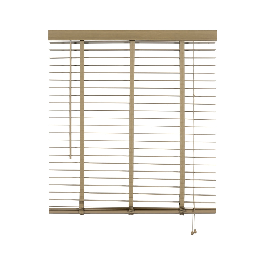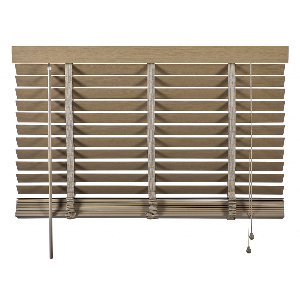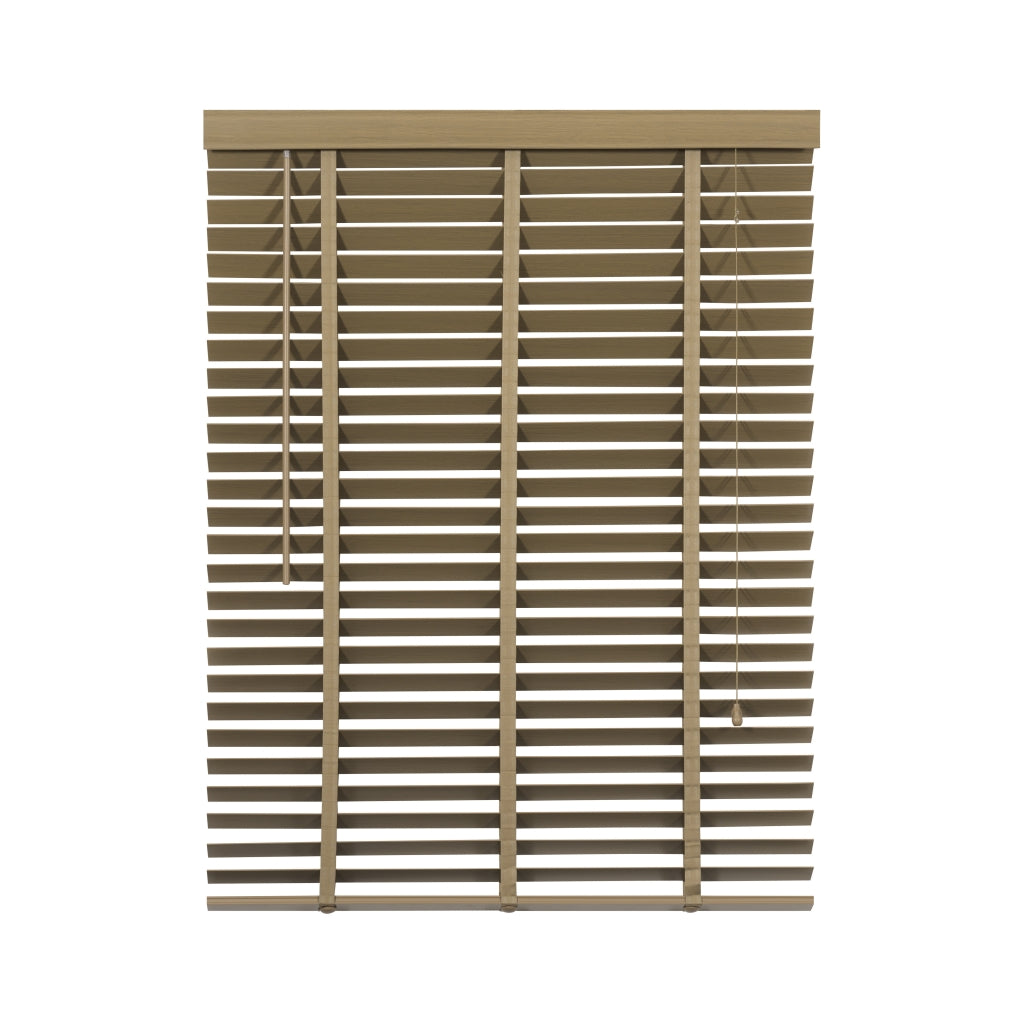 De lindehouten jaloezie in taupe tint straalt warmte uit met zijn natuurlijke vergrijsde look. Bovenop is er een aluminium cassette met een afdeklat, voorzien van een luxueus profiel voor een verfijnde afwerking. Zelfs de bedieningskoorden en verticale ladderbanden zijn in een bijpassende kleur, waardoor de jaloezie volledig in harmonie is met de taupe tint. De ladderbanden van 25 mm breed hebben een prachtige geweven textuur voor een extra fraai effect. Stylen met een taupe houten jaloezie: Een houten jaloezie in taupe tint brengt stijl en warmte in huis. De verweerde houtkleur is eenvoudig te mixen met bijvoorbeeld grijze en zachte pasteltinten. Het kan precies de juiste dosis warmte toevoegen aan een eigentijds interieur. Zelfs in een boho omgeving met veel beige en natuurlijke kleuren zal een taupe houten jaloezie schitterend passen. Pluspunten: • Scherpe prijs voor perfecte kwaliteit en afwerking • Op en neer beweging door bedieningskoorden • Draaistang om te kantelen • Ophangsteunen voor eenvoudig montage • Makkelijk in te korten • Leverbaar in veel standaardmaten (60 tot 220 cm breed) • In 2 trendy hout kleuren en basic zwart en wit leverbaar Minpunten: • Verduistert niet volledig • Niet geschikt voor vochtige ruimtes, zoals een badkamer Welke maat heb ik nodig? Bedenk van tevoren of je de jaloezie "in of op de dag" wilt hangen, dus in of op het kozijn. Wanneer je ze in de dag hangt, heb je geen last van de zijkanten die na het versmallen onafgewerkt zullen zijn. Dat zit dan mooi verborgen. Het voordeel van op de dag monteren is dat het beter verduistert dan in de dag montage. Let op: het inmeten is een secuur klusje. We adviseren om altijd 2x te meten om vergissingen te voorkomen. Montage op de dag (op het plafond of vlak boven het raam) 1. Meet voor de breedte het raam op 3 plaatsen 2. Voeg daar aan beide kanten 5 cm extra aan toe 3. Meet voor de lengte de hoogte tot aan de vensterbank of tot aan de vloer. Houd rekening met de hoogte van het ophangsysteem 4. Trek hier 1 cm vanaf Montage in de dag (tussen de kozijnen) 1. Houd rekening met draaiende en uitstekende delen, zoals hendels en grepen 2. Meet de breedte tussen het kozijn of de muren op 3 plaatsen 3. De breedte is de smalst gemeten maat. Trek hier 1 cm vanaf 4. Meet de lengte tussen het kozijn of muur en de vensterbank op 3 plaatsen 5. De lengte is de kortst gemeten maat. Indien je de jaloezie tot op de vensterbank wilt, trek er dan 1 cm vanaf Eenvoudige montage: 1. Volg eerst bovenstaande stappen voor het correct meten van de juiste maat jaloezie. 2. Meet en teken de plaats af waar de ophangsteunen moeten komen. 3. Zorg dat er genoeg speling is voor wanneer je de cassette met jaloezie in de steunen hangt. 4. Hang de extra beugel ter ondersteuning op, maar niet in het midden. Anders zit deze beugel op dezelfde plek als het ladderband. 5. Hang de jaloezie op door de cassette in de ophangsteunen te hangen en klik deze dicht. 6. Bevestig de ophangbeugels aan de afdeklat en schuif de afdeklat met beugels op de cassette. Je kunt gebruik maken van het dubbelzijdige tape om de afdeklat vast te maken. 7. Indien nodig kun je de lengte van de jaloezie inkorten (zie onderstaande stappen). Lengte jaloezie inkorten: 1. Hang de jaloezie languit naar beneden bij het op maat maken van de lengte. Zo kun je goed bepalen hoeveel lamellen er tussenuit moeten voor de juiste lengte. 2. Aan de onderzijde zitten doppen ter afwerking van het katoenen ladderband en het koord. Deze doppen kun je er makkelijk met je vingers of anders met een platte schroevendraaier uitduwen. 3. Na het weghalen van de doppen worden de knoopjes van de koorden zichtbaar. Het is soms even friemelen, maar haal de knopen los. 4. Nu zie je vaak meteen hoeveel lamellen er tussenuit moeten. Verwijder eerst de onderste, wat bredere, afwerk lamel en daarna het teveel aan lamellen. Schuif de brede afwerklamel weer tussen het ladderband en rijg het koord er doorheen. Maak de knoopjes opnieuw vast. 5. Knip het ladderband op de juiste lengte af. Zorg ervoor dat je dat niet te kort doet. Check onderaan even hoe dat eerder gedaan is en knip op dezelfde wijze het teveel aan band af. Plaats het ladderband met de doppen weer terug in de afwerk lamel, precies zoals het eerst zat. 6. Als finishing touch kun je ook het bedieningskoord op de juiste lengte maken. Duw de houten klosjes omhoog en knoop het koord hoger (op de juiste lengte) weer vast. Knip het overtollige koord aan de onderkant af en duw de klosjes weer terug naar beneden over de knoopjes heen. Nu is de look helemaal af. Onderhoud: Om je houten jaloezie in topvorm te houden is regelmatig onderhoud belangrijk. Om ze snel op te frissen gebruik je een stofdoek, plumeau of de stofzuiger. Draai de jaloezieën dicht en ga er met een stofdoek of plumeau overheen. Het kan ook met de stofzuiger, zet ‘m dan wel op de laagste stand en gebruik een kleine opzetborstel. Voor een wat diepere reiniging kun je de lamellen afnemen met een licht vochtige doek en een zacht reinigingsmiddel.| Afmetingen | |