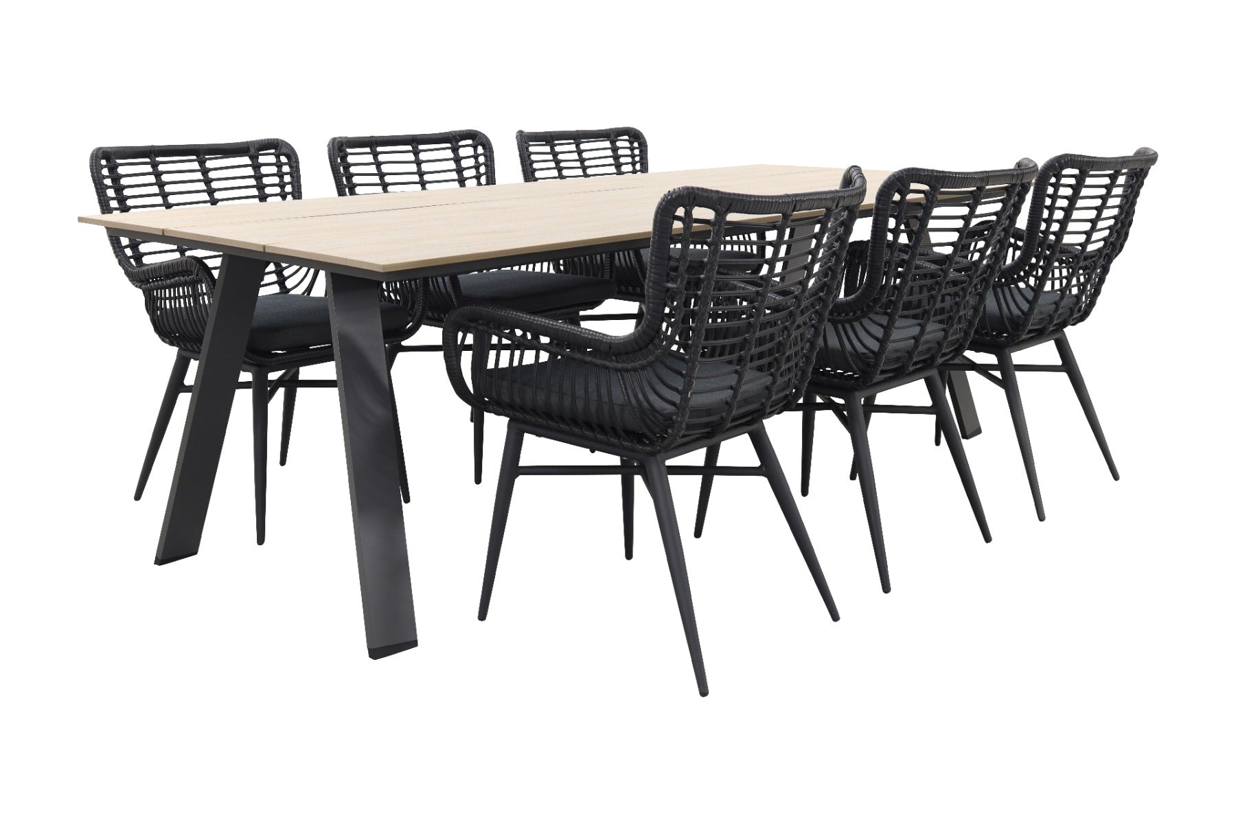 Hou je van een retro uitstraling in de tuin? Dan is deze 6-persoons tuinset met Jasmine wicker stoelen en een royale Nevada tuintafel een uitstekende keuze. De Jasmine diningstoelen bieden heerlijk zitcomfort en nodigen uit tot lange avonden tafelen. De combinatie met de robuuste Nevada tuintafel maakt deze set helemaal af. Perfect voor een diner met vrienden of een gezellige middag met het gezin. Bestel eenvoudig online!