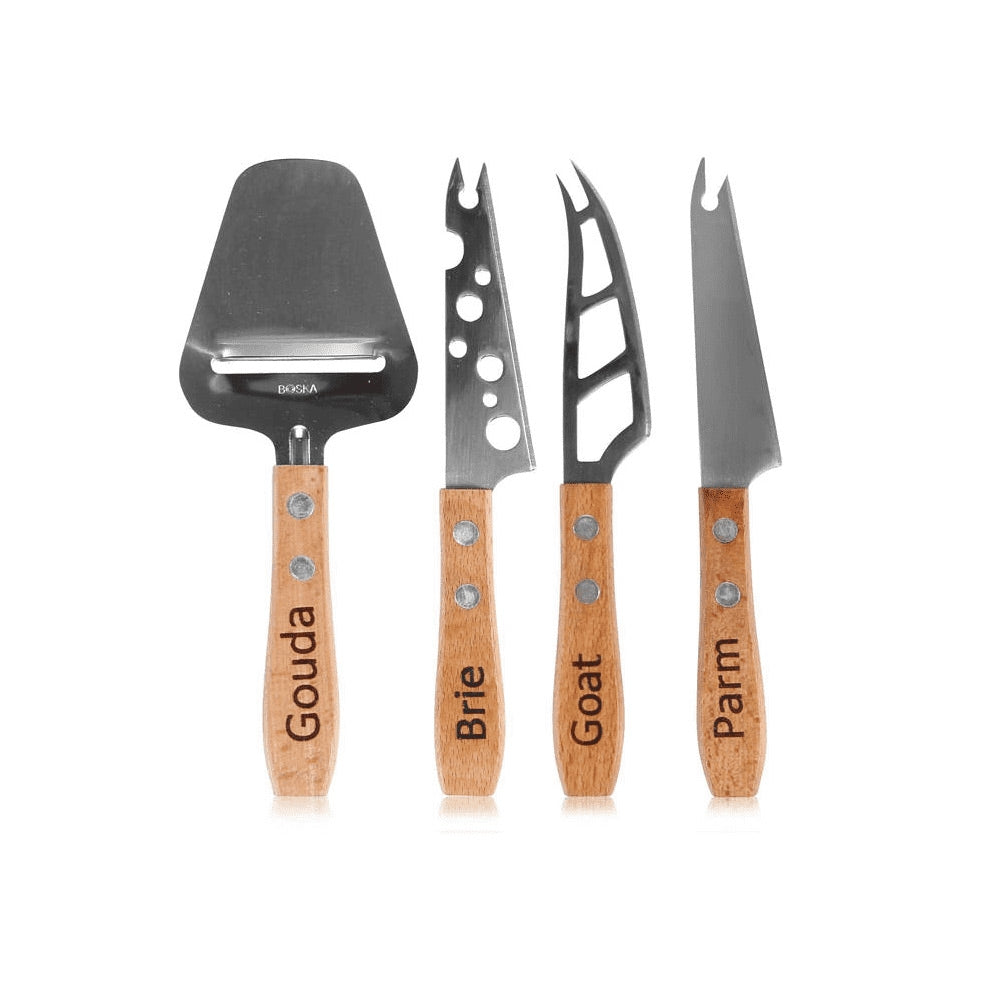 Snij en schaaf de lekkerste kazen met de Kaasset Mini Geneva van BOSKA. De handvatten van de kaasschaaf en drie kaasmessen zijn gemaakt van rustiek beukenhout. Deze compacte en mooie set is perfect voor bij het serveren van een kaasplankje. De gaten in het lemmet van twee messen zorgen voor minder contact tussen de kaas en het mes. Hierdoor blijft zachte kaas tijdens het snijden niet kleven, wat het snijden een stuk eenvoudiger maakt. Gebruik de punt om een stuk kaas aan iemand aan te rijken, zonder er met je handen aan te zitten. Op het beukenhouten handvat staat de kaassoort waarvoor je de tool kunt gebruiken. Natuurlijk zijn er nog veel meer soorten kaas die je met deze set kunt snijden of schaven. Was de tools na gebruik even met de hand af. Dan blijven ze op z’n mooist. Je krijgt standaard 10 jaar garantie op de Kaasset Mini Geneva van BOSKA.