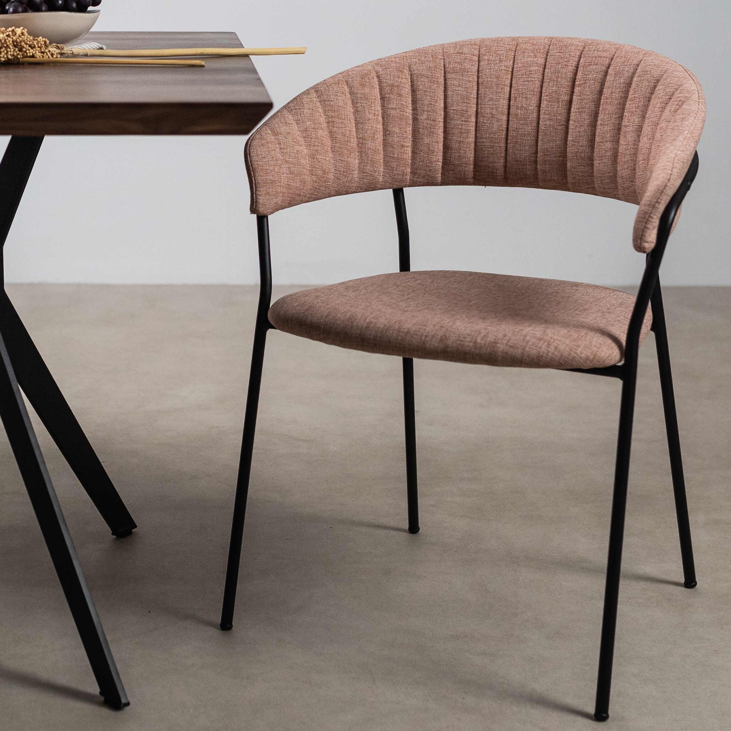 - Roze zitting en rugleuning met zwarte stalen poten, boho-stijl met armleuningen.