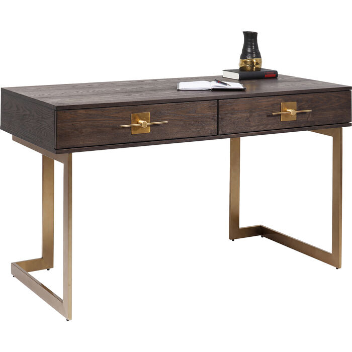 Het donkere essenhout creëert een uiterst stijlvolle look in combinatie met het glanzende messingkleurige onderstel Aan de voorzijde is het bureau voorzien van twee handige opberglades Ook de handvaten van de lades zijn gemaakt van glanzend RVS Het messingkleurige onderstel voegt een vleugje Japanse esthetiek toe en creëert een moderne Aziatische stijl in huis Combineer het Osaka bureau met andere meubelen uit deze stijlvolle meubelserie en met luxe gouden of marmeren accessoires