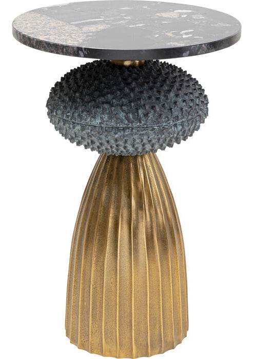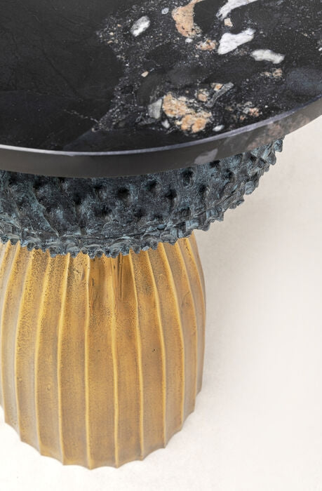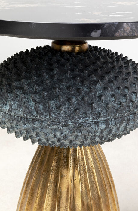 - Het tafelblad is gemaakt van marmer en het onderstel is afgewerkt met messing