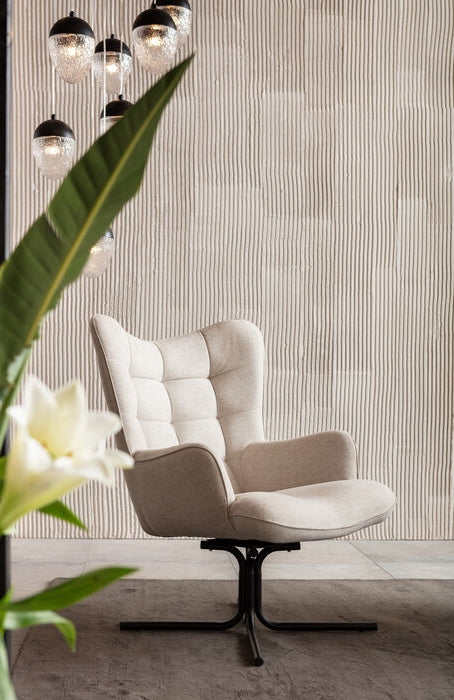 - Kare Oscar Bouclé fauteuil, een tijdloos Scandinavisch design in verfijnde crèmekleur.
