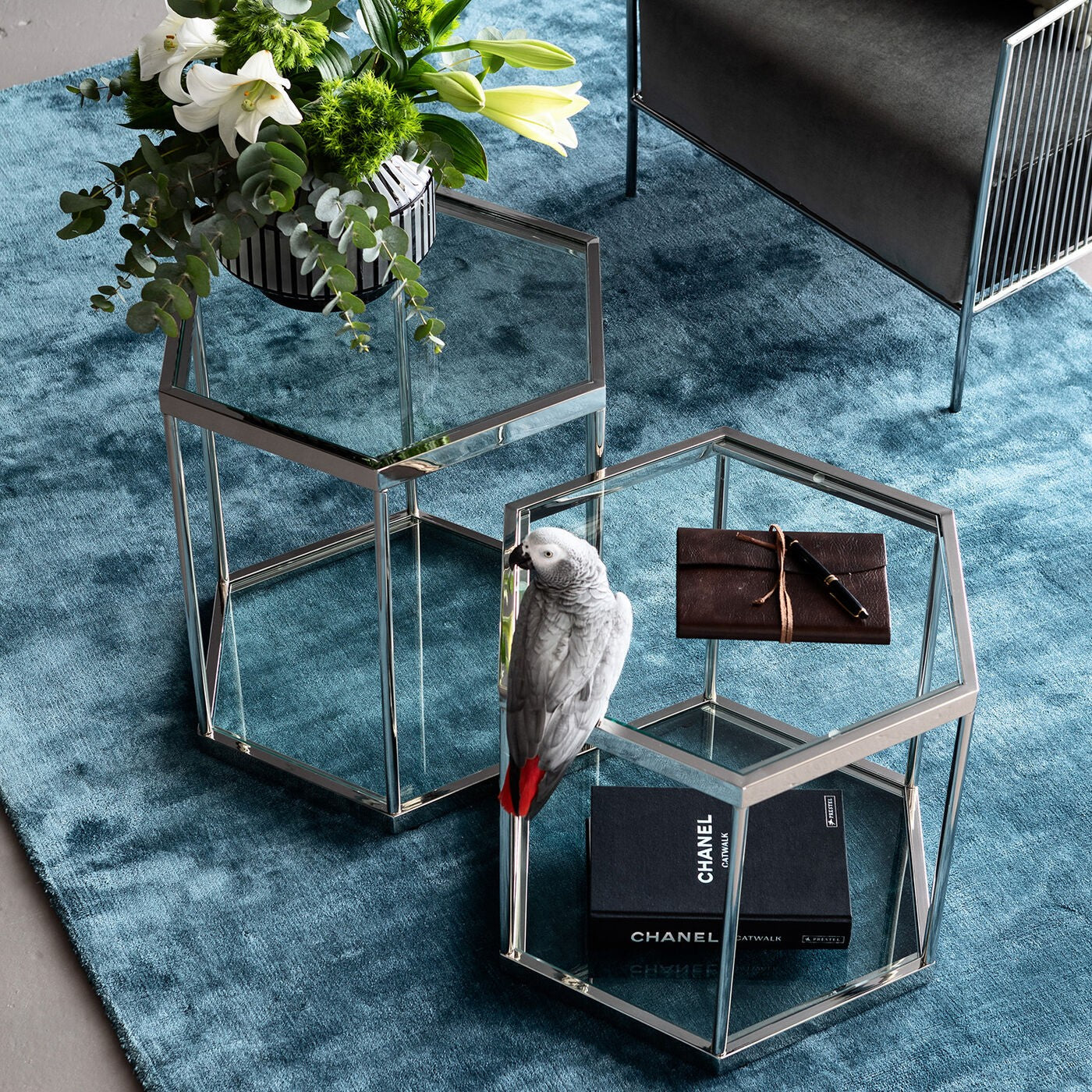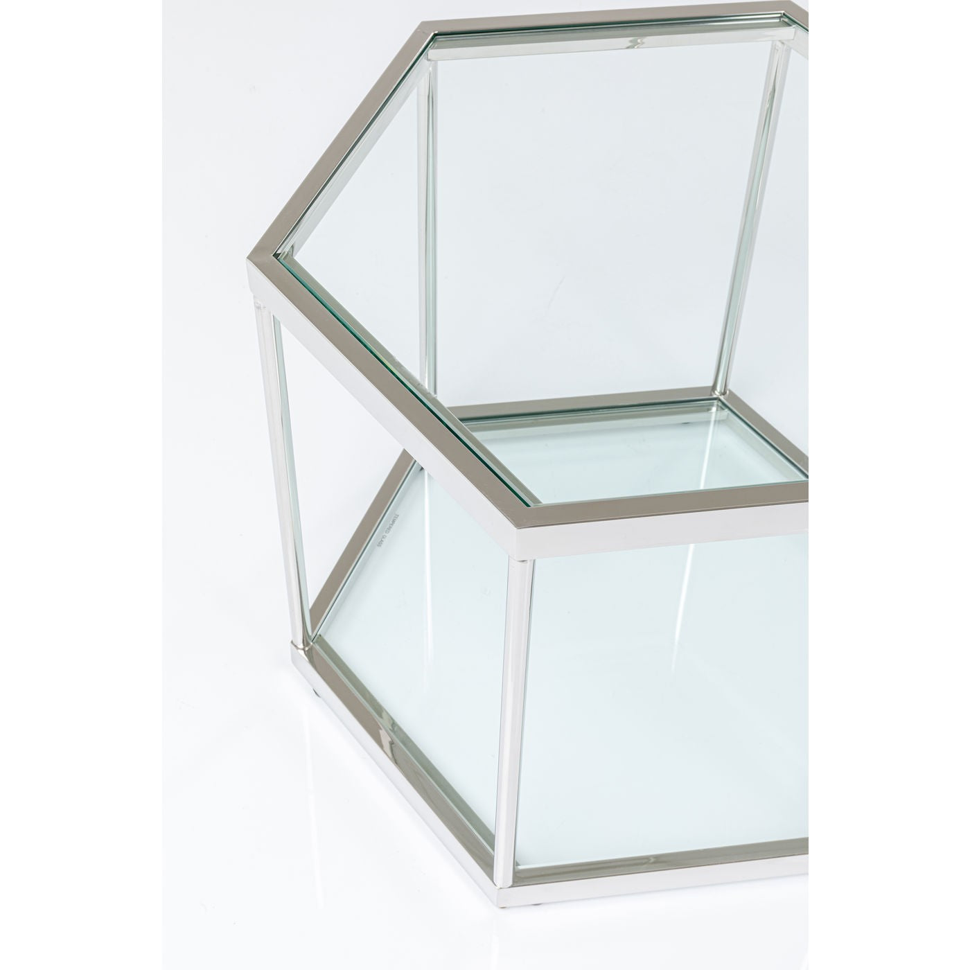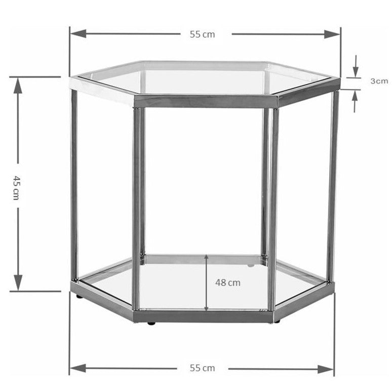- Stalen poten en zeshoekig glazen blad in een elegante zilveren afwerking.
