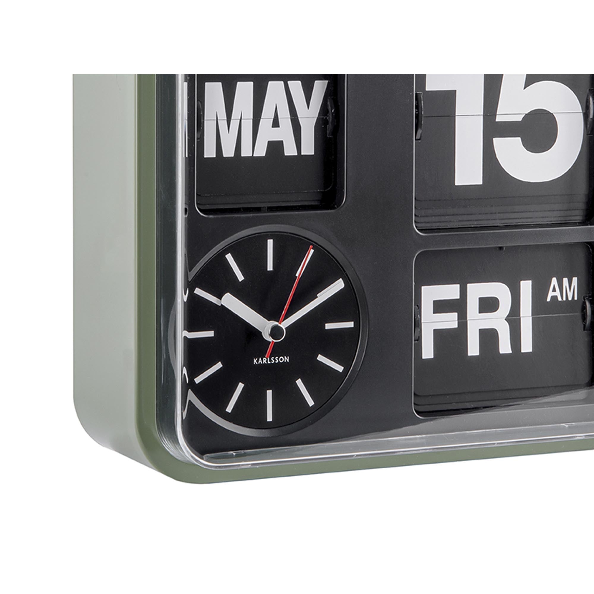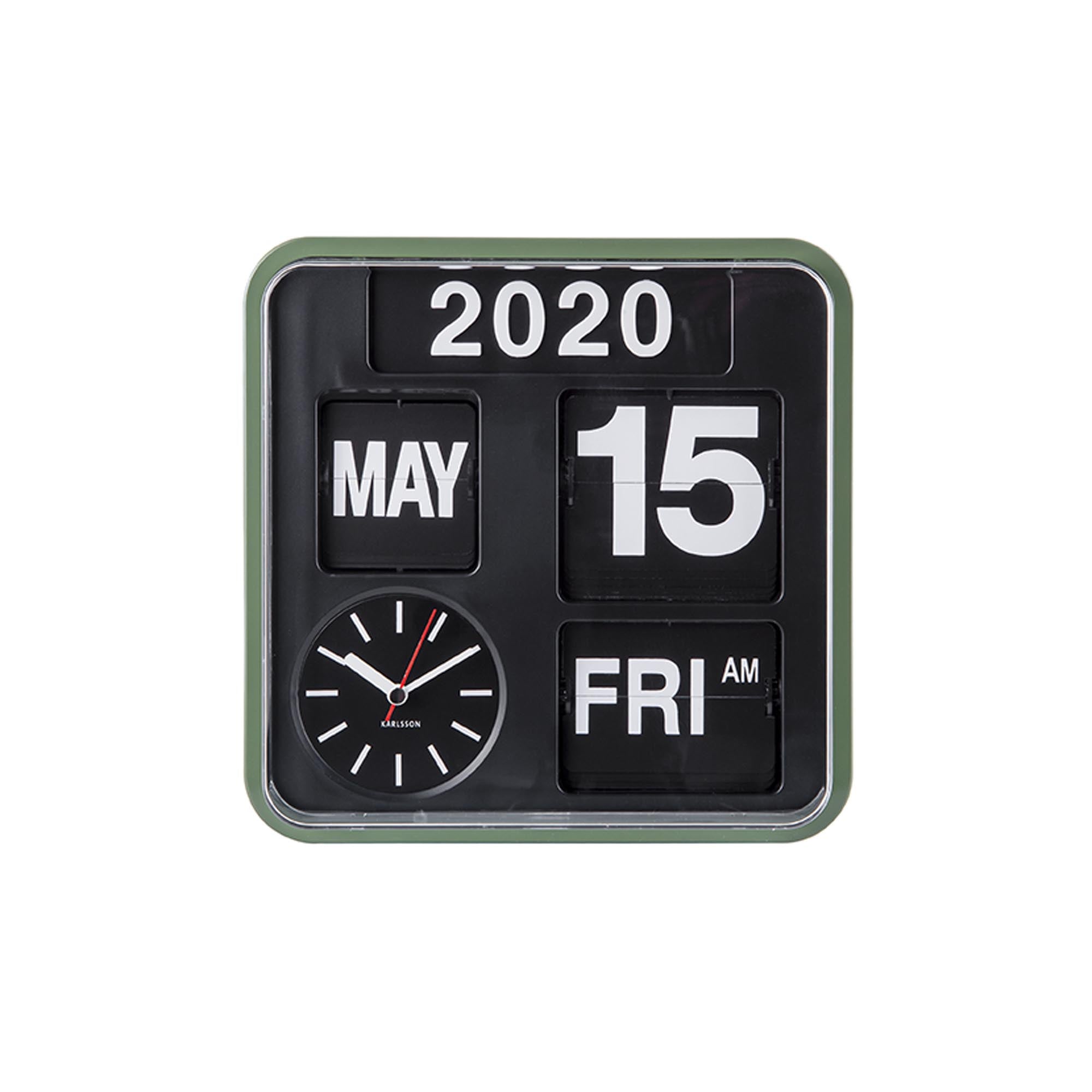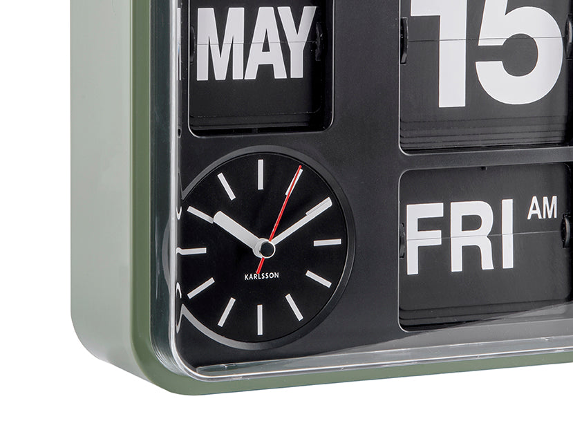 - Een analoge klok met een flip ontwerp en datumaanduiding
