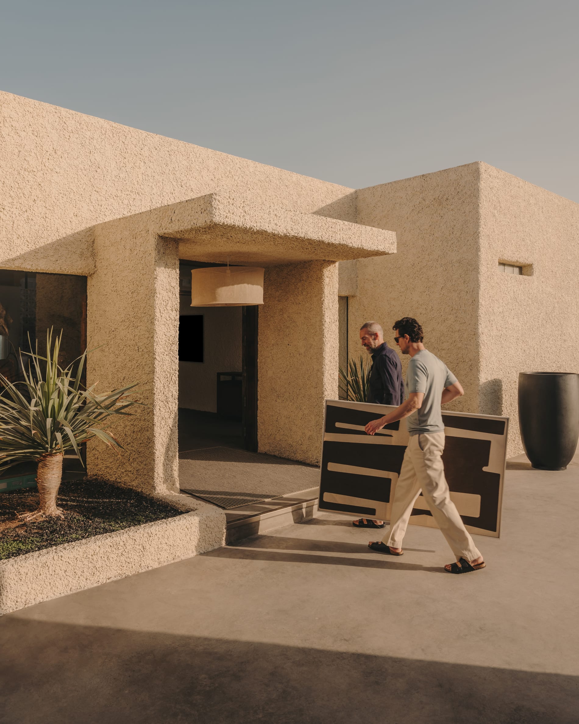 Salmi speelt met positieve en negatieve kleuren, waarbij de silhouet vorm krijgt door overlappende afgeronde geometrische vormen. De korrelige textuur en reliëfs benadrukken de delicatesse van de compositie.