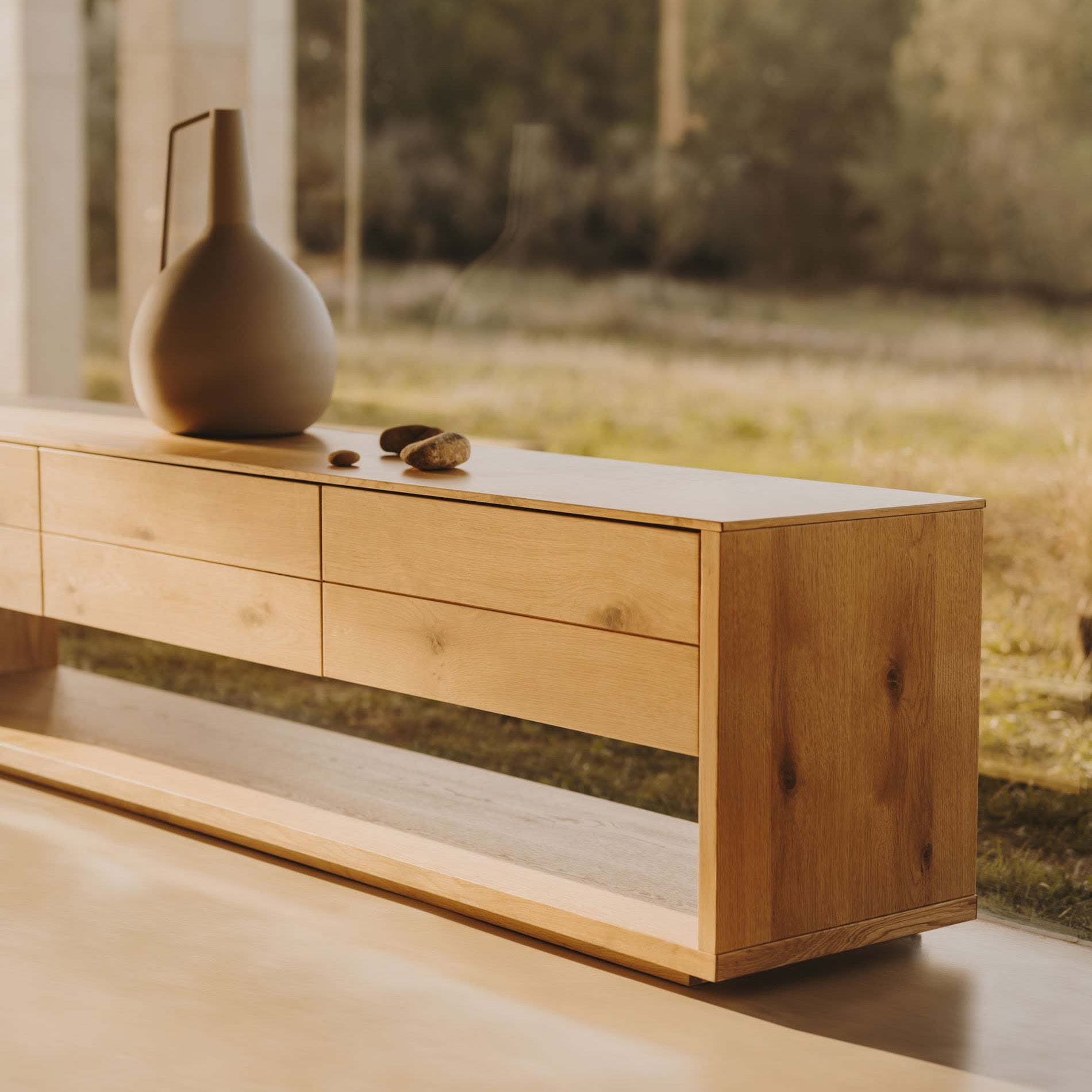 - TV-meubel in eikenfineer met natuurlijke afwerking.