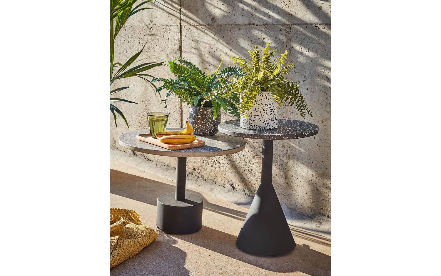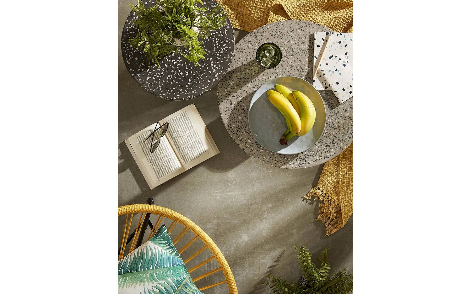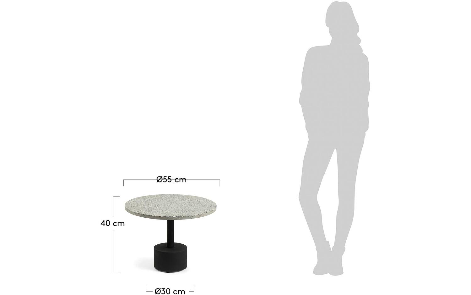 - Bijzettafel met keramisch blad van terrazzo met een grijze bodem.